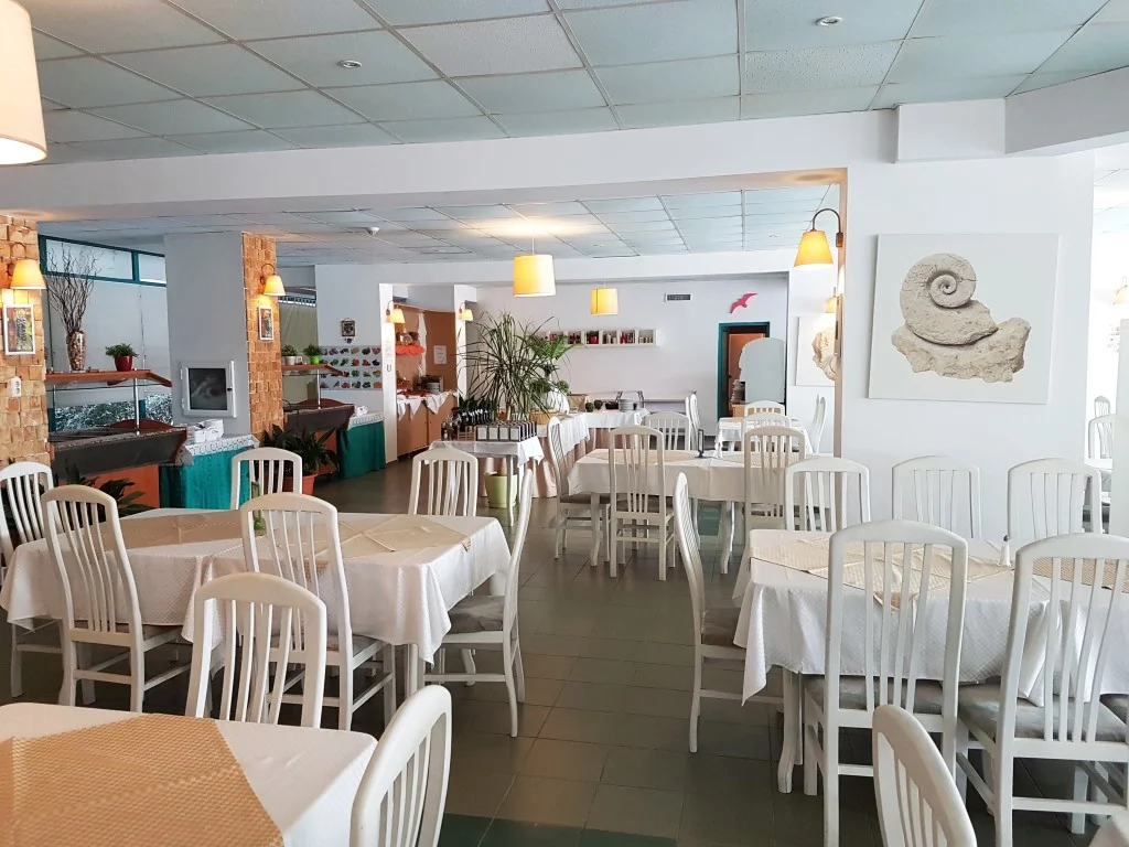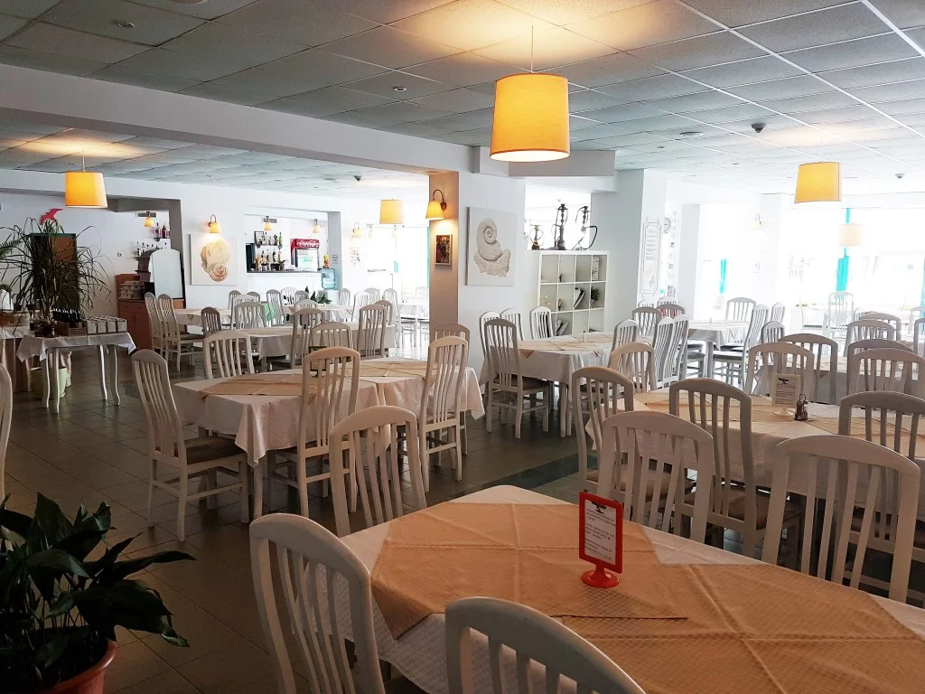 Programul All Inclusive al hotelului Delfin funcționează zilnic între orele 08:00 și 22:00 și acoperă toate mesele principale, gustările și băuturile locale. Micul dejun (08:00–10:00) se servește în restaurantul principal sub formă de bufet și include produse lactate, mezeluri, ouă, pâine, unt, cereale, fructe, legume, ciocolată, gem și lapte. Micul dejun târziu (10:30–11:30) este disponibil la barul de la piscină și cuprinde prăjituri, produse de patiserie, dulciuri, fructe și înghețată. Prânzul (12:00–14:00) și cina (18:30–21:00) se servesc în restaurantul principal, ambele în formula bufet, cu salate, supe calde și reci, preparate din carne și vegetariene, garnituri variate, paste, deserturi și înghețată. Gustarea de după-amiază (15:30–17:00) este disponibilă la barul de la piscină și include croissante, pizza, prăjituri și fructe. Băuturile calde (cafea, cappuccino, lapte cu cacao, ceai) sunt disponibile din automat în restaurant și la baruri între 10:00 și 22:00. Băuturile răcoritoare (Coca-Cola, Fanta, Sprite, sucuri, apă) sunt incluse în același interval. Băuturile alcoolice locale – whisky, vodcă, gin, bere, vin, raki, mastic, mentă – sunt incluse în restaurant pe durata meselor și la baruri între 12:00 și 22:00. Băuturile internaționale și de marcă se achită separat.
