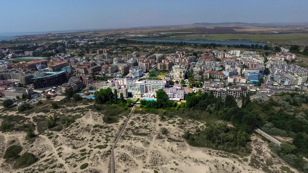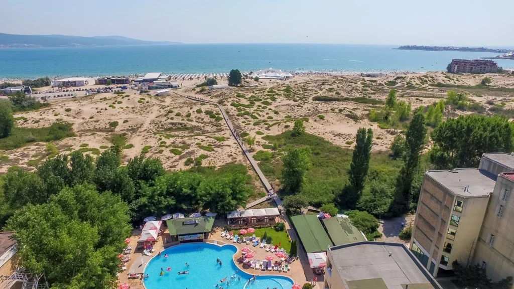 Hotel Delfin se află la doar 100 de metri de plaja cu nisip din Sunny Beach, ceea ce înseamnă că în câteva minute ești deja cu picioarele în nisip. Hotelul este poziționat la aproximativ 2 km de centrul stațiunii, oferind liniște fără a sacrifica accesul la magazinele, restaurantele și viața de noapte specifice acestei destinații. Sunny Beach este deservit de aeroportul internațional Burgas, situat la circa 35 km distanță, de unde transferul spre hotel durează aproximativ 30-40 de minute.