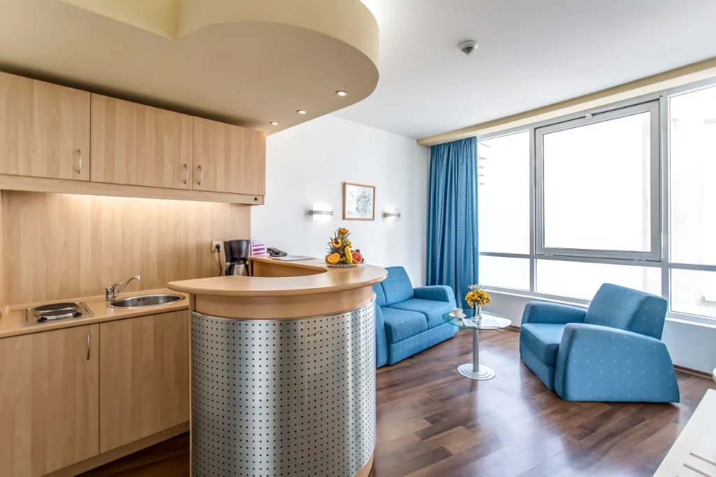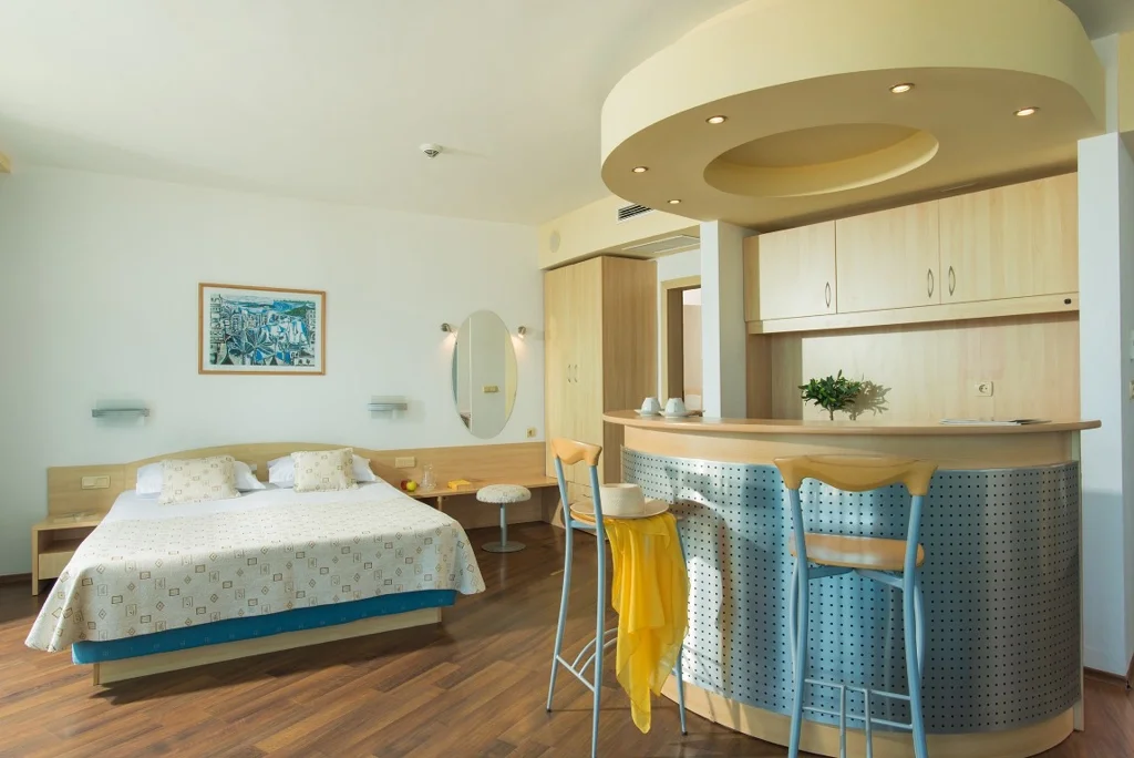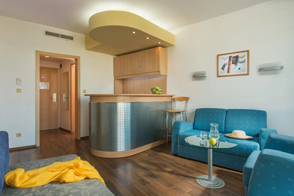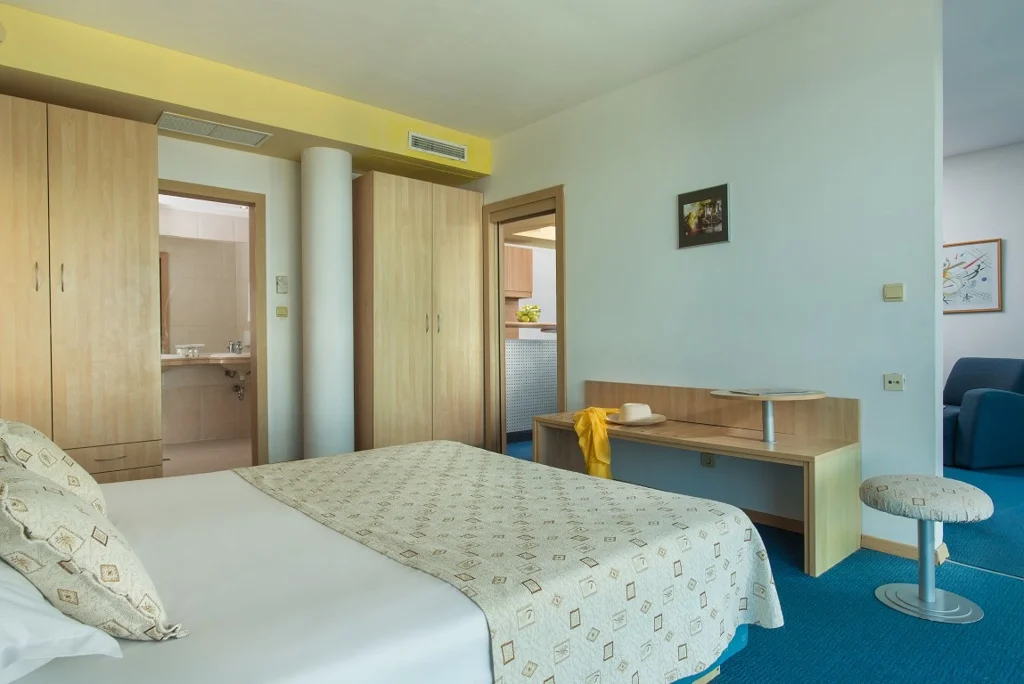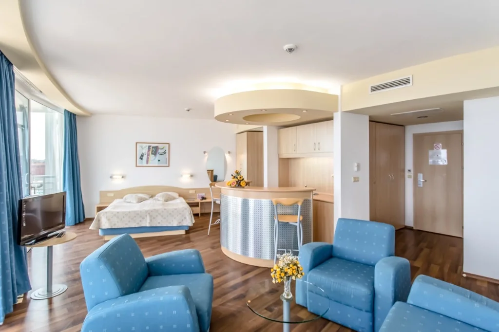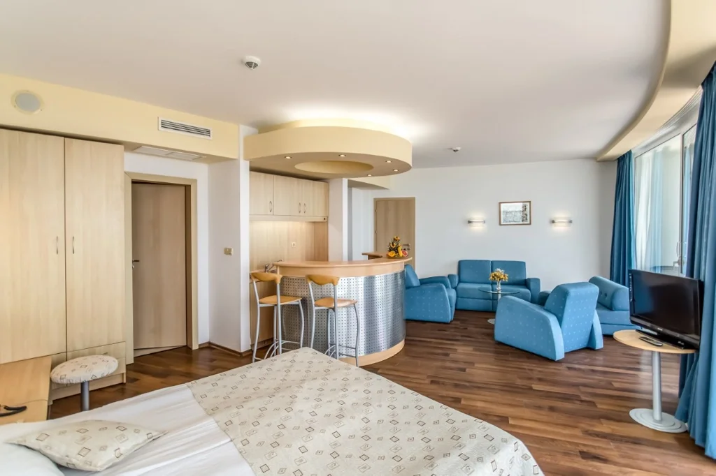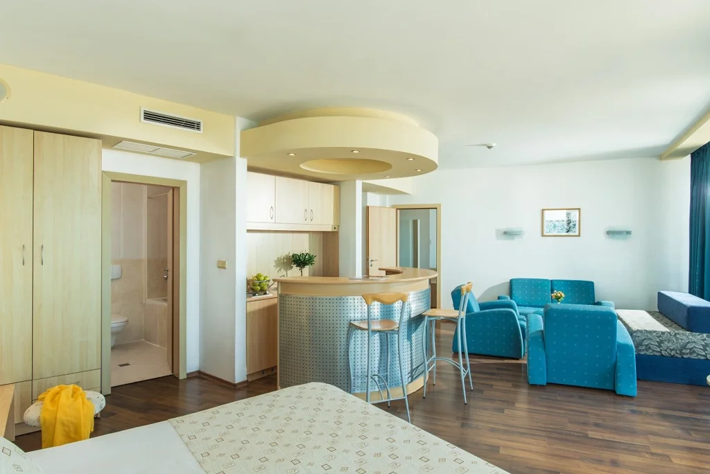 Apartament cu 1 Dormitor – 35 m², capacitate maximă 2+2/3+1 persoane. Compus dintr-un living cu canapea și un dormitor separat cu pat dublu, conectate printr-o ușă. Include pat suplimentar (canapea extensibilă), aer condiționat central, TV prin satelit, minibar gratuit, seif, fierbător, Wi-Fi gratuit, 2 băi cu cadă/duș, balcon mobilat și pardoseală laminată. Vedere laterală la mare.