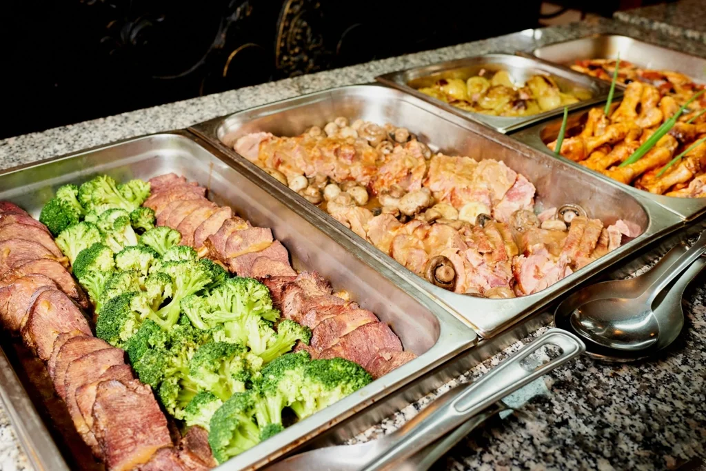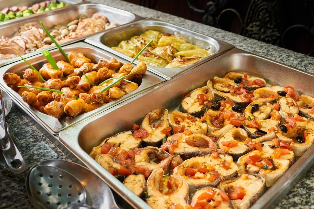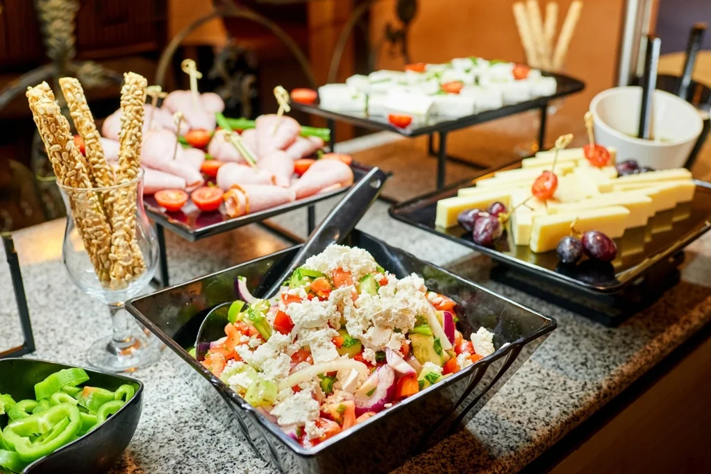 Regimul All Inclusive de la Hotel Forum SB acoperă toate mesele principale servite în restaurantul principal tip bufet: micul dejun între orele 07:30 și 10:00 (cu ceai, cafea, lapte, apă și suc), prânzul între orele 12:00 și 14:00 și cina între orele 18:00 și 20:30 – ambele incluzând apă, băuturi răcoritoare, băuturi calde, bere, vin roșu și alb. Săptămânal sunt organizate două bufeturi tematice: unul bulgăresc și unul Forum, pentru a diversifica experiența culinară. La barul All Inclusive, băuturile locale alcoolice și nealcoolice sunt disponibile nelimitat între orele 11:00 și 23:00. Snack-urile sunt servite în zona de bar astfel: între orele 11:00 și 15:00 – sandvișuri, pizza, hot dog, burger și bruschette; între orele 15:00 și 17:00 – clătite, gogoși, deserturi și dulciuri; iar înghețata este disponibilă tot între orele 15:00 și 17:00. Ceaiul, cafeaua și laptele sunt disponibile zilnic între orele 10:00 și 23:00.