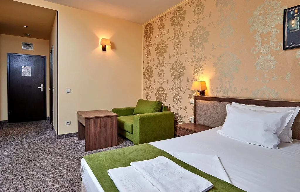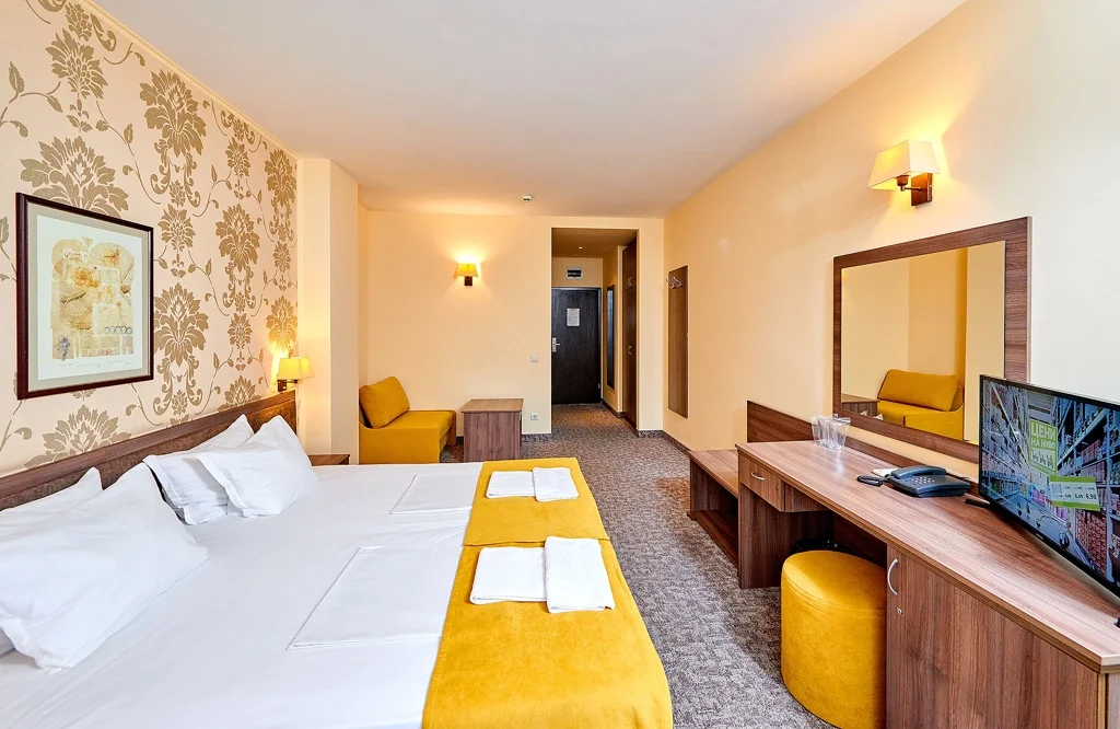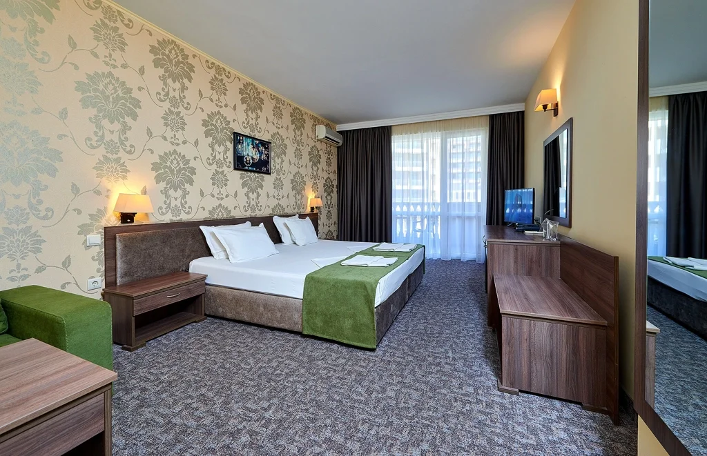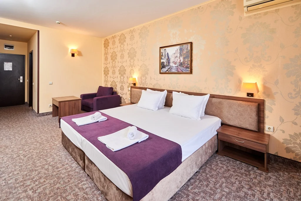 Camera dublă – 25 m², cu capacitate de până la 3 persoane, dispune de două paturi separate și o canapea extensibilă. Dotările includ aer condiționat individual, TV cu ecran plat prin satelit, mini-frigider, seif gratuit, Wi-Fi gratuit, baie cu duș, uscător de păr și articole de toaletă, balcon și fier de călcat inclus. Camera oferă vedere la parc, iar curățenia se efectuează zilnic. Schimbarea lenjeriei de pat se face la fiecare 3 zile, iar prosoapele sunt înlocuite zilnic.