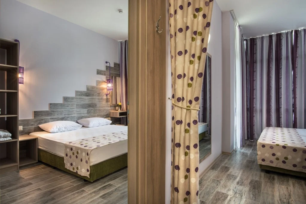 Studii - 35 m2, pot acomoda până la 4 persoane, cu vedere la mare sau parc, dotări identice cu camerele duble.
