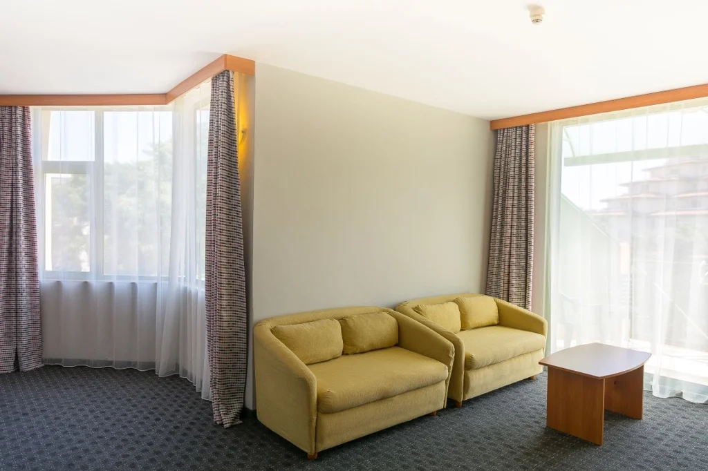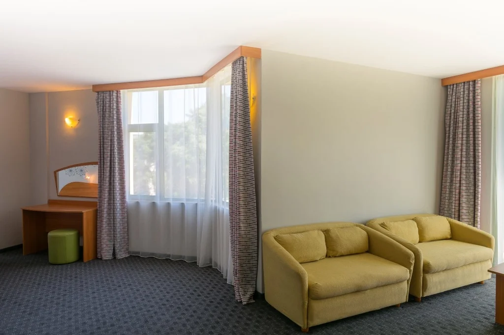 Suite Junior - 40 m², capacitate maximă 2+2 persoane, constând din dormitor și living, dotate similar cu camerele duble standard, oferind spațiu suplimentar și confort pentru întreaga familie sau grup.