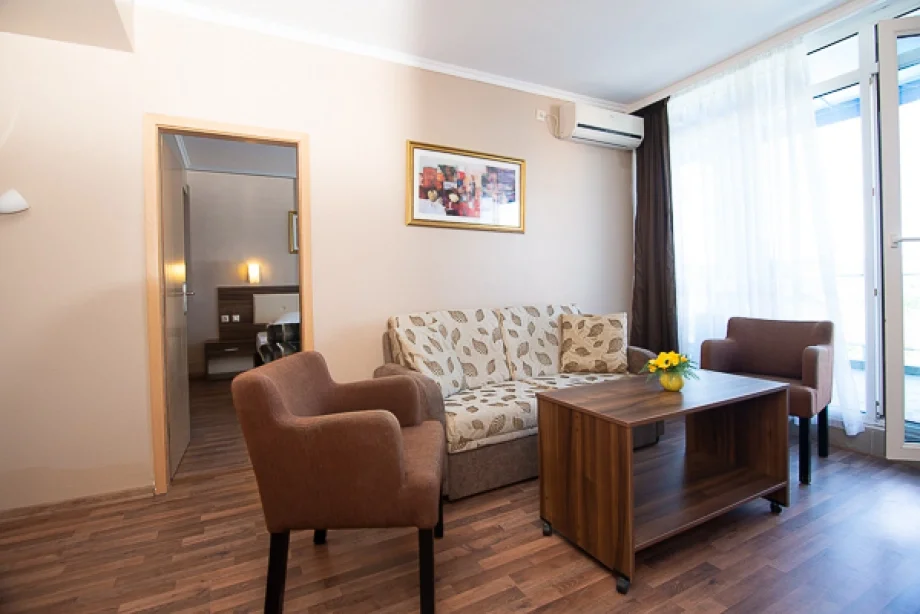 Apartament cu 1 Dormitor – 55 mp, conceput pentru familii de până la 4 persoane (2 adulți + 2 copii), apartamentul dispune de un dormitor cu pat king-size și o cameră separată cu două paturi single care pot fi unite, plus un fotoliu extensibil ca pat suplimentar. Camerele sunt legate printr-o ușă comunicantă. Toate dotările standard sunt prezente: aer condiționat individual, TV prin cablu, Wi-Fi gratuit, fierbător, seif gratuit și balcon mobilat. Baia este echipată cu duș, uscător de păr, prosoape și produse cosmetice.