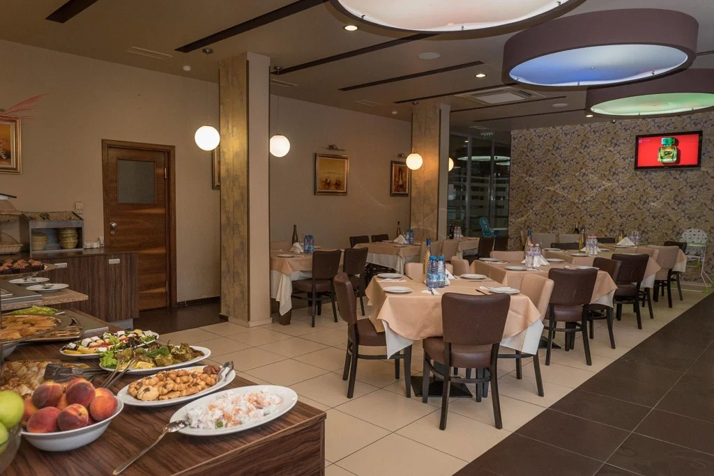 Regata Palace funcționează în regim All Inclusive Light, cu mese servite în restaurantul principal tip bufet, după cum urmează: micul dejun continental este disponibil între orele 07:30 – 10:00 și include o gamă variată de preparate, cafea Schwartz, ceaiuri, lapte, iaurt, sucuri și punch fără alcool, apă minerală. Prânzul cu bucătărie internațională se servește între 12:30 – 14:00, iar cina tot cu bucătărie internațională între 18:30 – 20:30. La prânz și cină sunt incluse băuturile alcoolice locale, sucuri, băuturi carbogazoase, vin alb și roșu la pahar, bere la halbă și apă minerală. Gustările de după-amiază sunt disponibile la restaurant între 16:00 – 16:30 și constau în sandvișuri sau pizza, deserturi, prăjituri, cafea instant, ceai și înghețată. La barul de la piscină, băuturile locale sunt incluse zilnic între orele 10:30 – 22:00 și cuprind alcool bulgăresc (rachie, vodcă, gin, whisky, brandy), vin, bere, cafea instant, ceai, băuturi carbogazoase și apă minerală. Băuturile internaționale și cele de la barul din hol se achită separat.