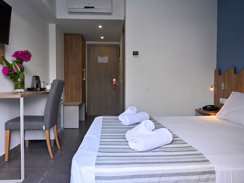 Hotelul dispune de camere simple și confortabile, dotate cu aer condiționat, telefon, minibar (gol) și facilități pentru prepararea ceaiului sau cafelei. Camerele au băi private cu duș, iar unele au balcoane cu vedere la oraș, munte sau piscină. Camerele sunt curățate zilnic, iar hotelul oferă camere non-fumători.