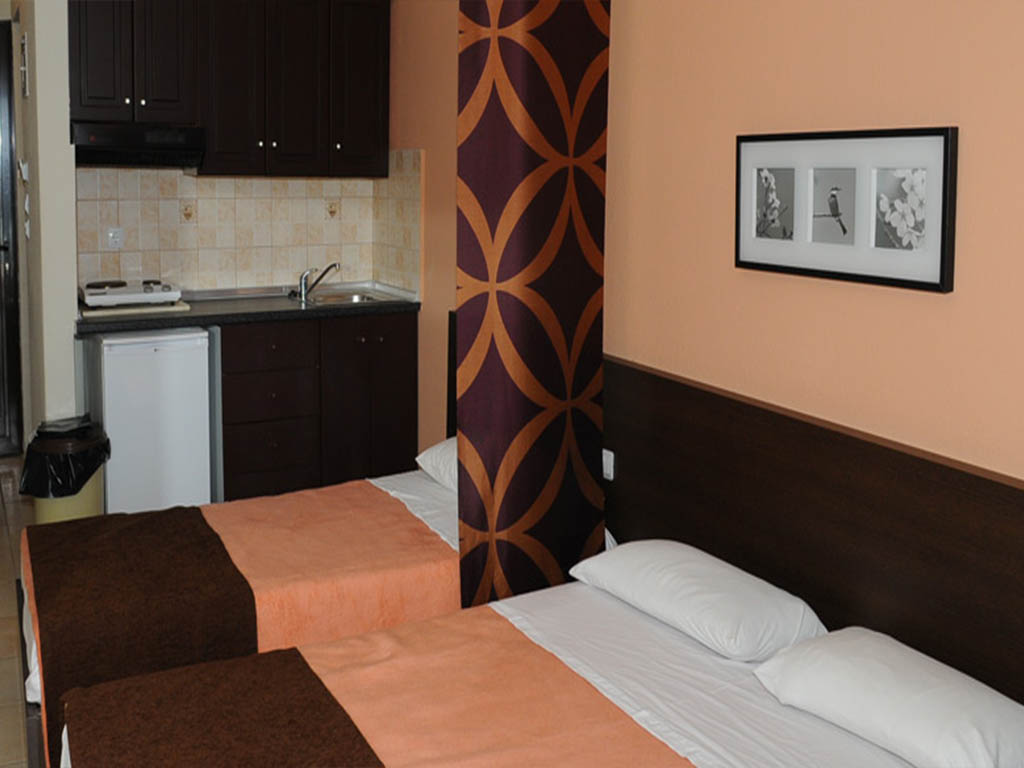 Camerele dispun de chicineta (aragaz electric cu 2 plite, ustensile), aer conditionat, TV, mini-frigider, Wi-Fi gratuit, baie (dus), uscator de par (in unele camere, gratuit) si balcon/terasa. Pat dublu sau 2 paturi single.