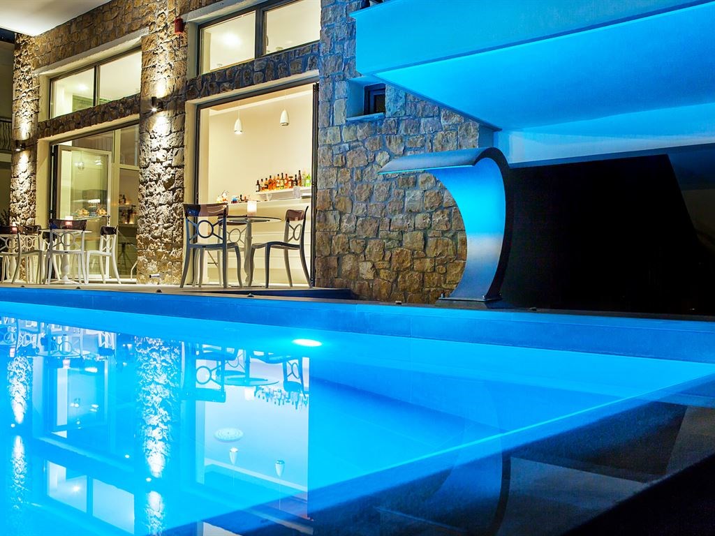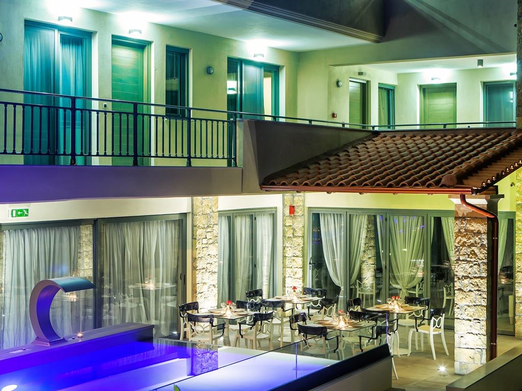 Restaurantul servește preparate à la carte din bucătăria mediteraneană și internațională, într-o sală de mese decorată minimalist, cu podea de marmură și mobilier de design. Barul elegant este ideal pentru băuturi seara şi pentru mese uşoare în timpul zilei.