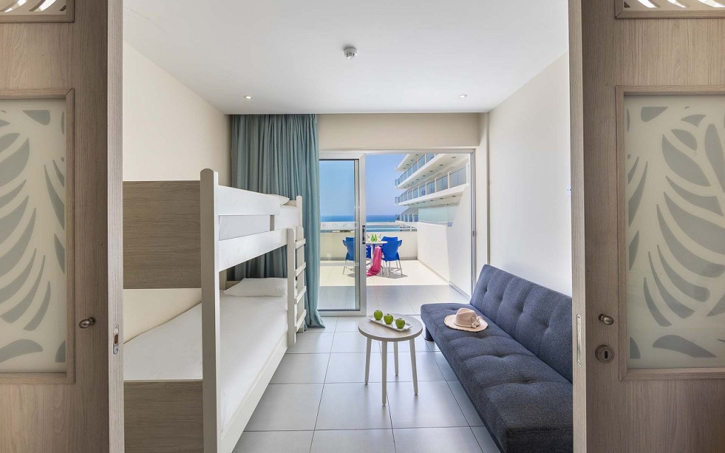 Family Room Sea View: Această cameră oferă un televizor, seif în cameră, Wi-Fi, telefon, balcon, duș, uscător de păr, aparat de aer condiționat personal, frigider mini și o vedere superbă la mare. Suprafață: 43 m². Capacitate maximă: 6 persoane.