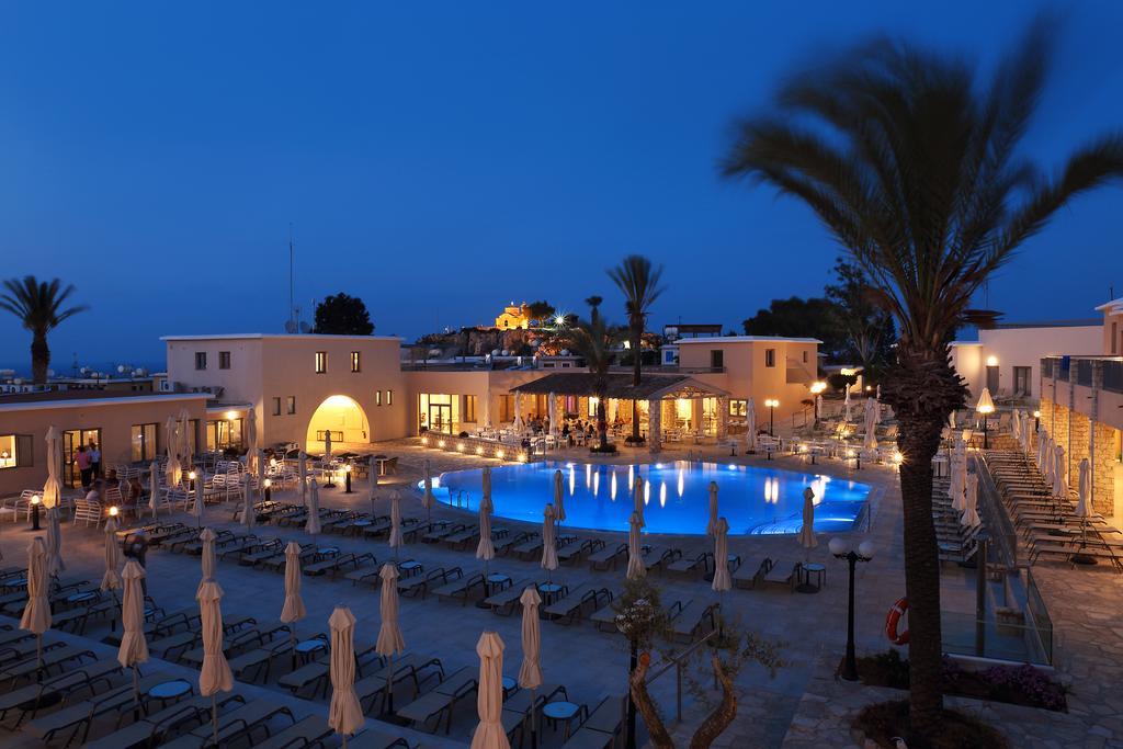 Oaspeții pot lua prânzul È™i cina la o tavernă tradițională grecească sau la restaurantul principal. Există de asemenea un bar principal și un bar la piscină. Dimineața se serveÈ™te un mic dejun cipriot certificat. Pachetul ultra all inclusive oferă băuturi alcoolice de calitate din import.
