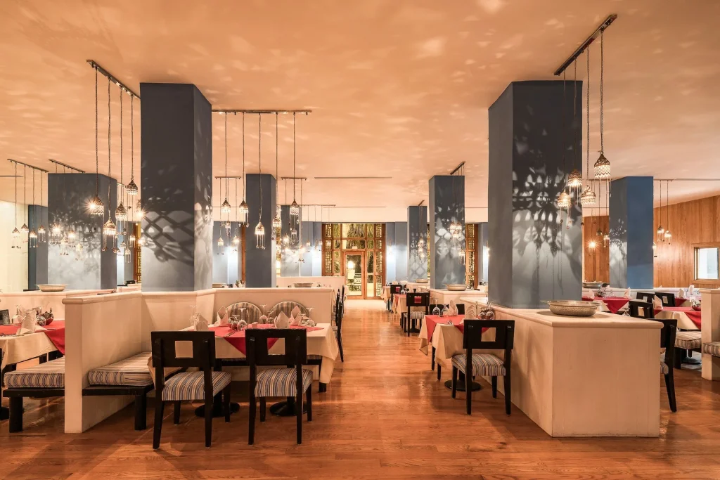 Sejurul in regim All Inclusive la Grand Hotel Sharm El Sheikh acopera toate mesele principale servite la bufet: mic dejun, pranz si cina. Pe parcursul zilei, oaspetii pot beneficia de gustari usoare, cafea, ceai si produse de patiserie disponibile la orele stabilite. Bauturile alcoolice si non-alcoolice de productie locala sunt incluse in pachet si pot fi consumate in functie de programul de functionare al fiecarui bar din hotel, inclusiv la lobby bar, la barul de langa piscina si la barul de pe plaja. Bauturile internationale de import nu sunt incluse in pachetul All Inclusive si se pot comanda contra cost. Restaurantele à la carte (asiatic, oriental, indian, italian) functioneaza separat, cu rezervare si plata aditionala.