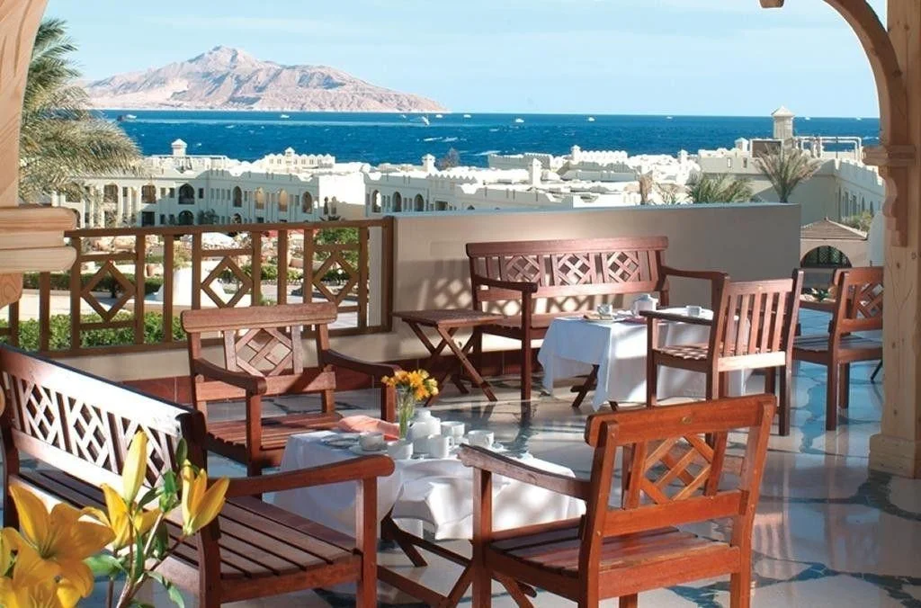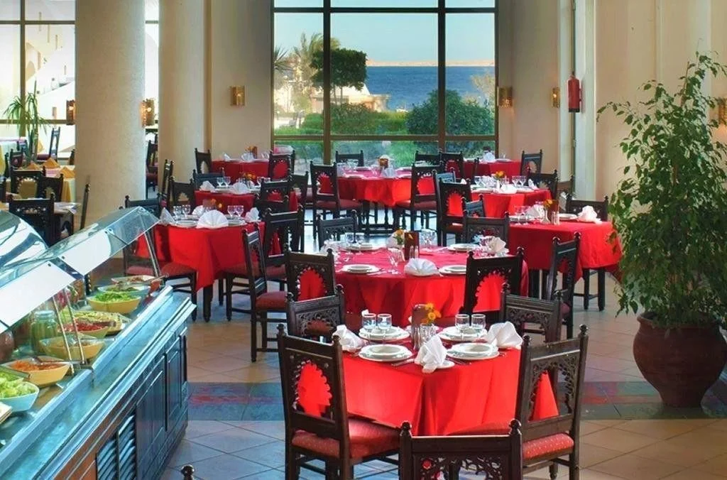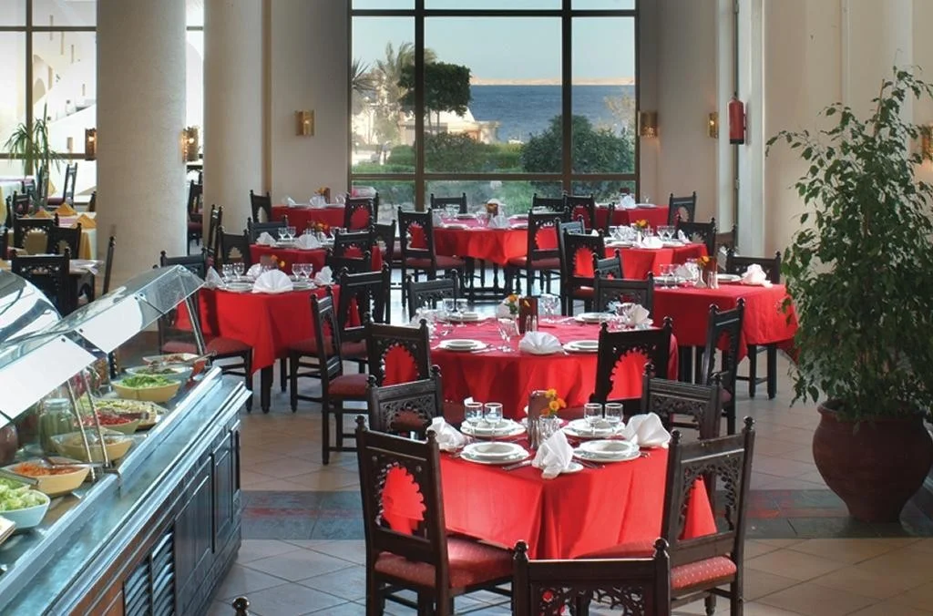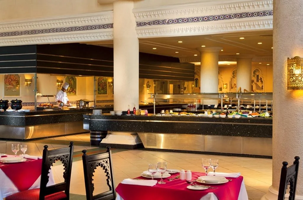 Restaurantele tematice a la carte (peste, franceza, japoneza, egipteana, libaneza) ofera cina intre 18:30 si 22:00, cu rezervare prealabila, o data per sejur gratuit. Restaurantul de pe plaja serveste pranz usor tip bufet intre 12:00 si 14:00, iar bauturile racoritoare, berea si alcoolul local sunt disponibile de la 10:00 pana la apus. Barul de langa piscina ofera brunch intre 10:30 si 12:00, gustare de dupa-amiaza intre 13:00 si 16:00, precum si bauturi pe toata durata zilei pana la apus. Lobby barul serve ceai, cafea si dulciuri intre 16:30 si 17:30, cina tarzie intre 01:00 si 03:00 si bauturi non-stop. Retineti ca bauturile internationale nu sunt incluse in pachetul standard, doar cele de productie locala.