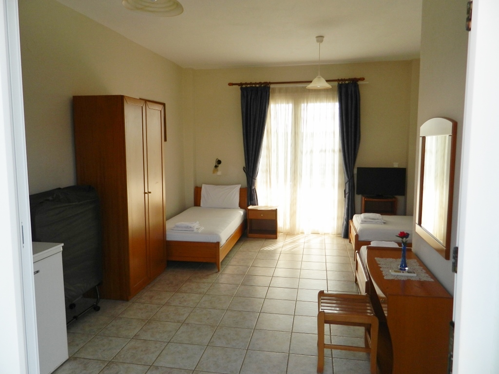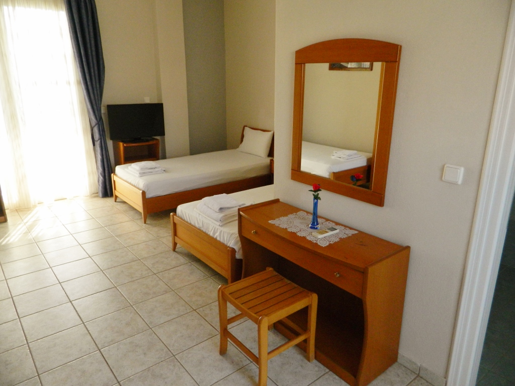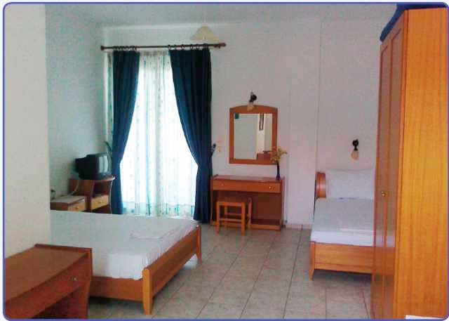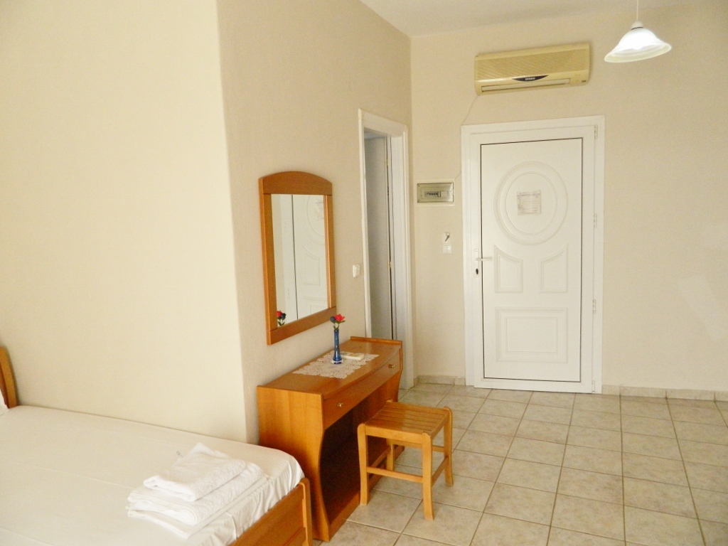 Situata in centrul statiunii Kalithea, la doar 150 de metri de plaja intinsa cu nisip fin din statiune, se ofera spre cazare studiouri duble si triple foarte spatioase, dotate cu baie proprie cu dus, frigider, bucatarie proprie tip kichineta, echipata cu plita, vesela, tacamuri, TV, balcon cu vedere (laterala/ frontala la mare).