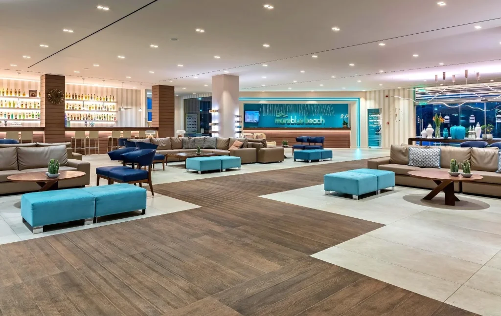 Mareblue Beach ofera un regim All Inclusive generos, care acopera toate mesele principale si gustari pe parcursul zilei. Micul dejun se serveste tip bufet, cu posibilitatea unui mic dejun continental tarziu intre orele 10:00-10:30. Pranzul este disponibil ca bufet, iar cina se serveste tot tip bufet, cu mentiunea ca pentru masa de seara este necesara tinuta formala. Pe parcursul zilei, intre orele 12:00-16:00 este disponibila o gustare usoara, iar copiii se pot bucura de inghetata gratuita intre 10:30 si 23:00. Bauturile alcoolice si nealcoolice de productie locala selectata sunt incluse intre orele 10:30 si 23:00. Bauturile internationale nu sunt incluse in pachetul all inclusive. Orele de servire pot fi modificate in functie de sezon.