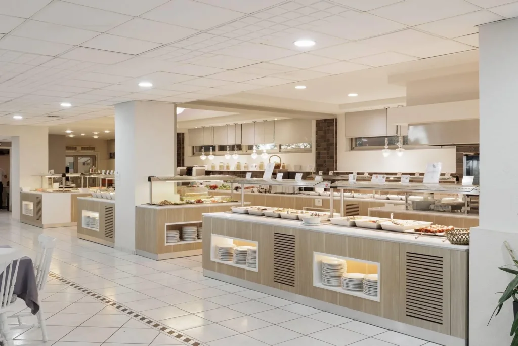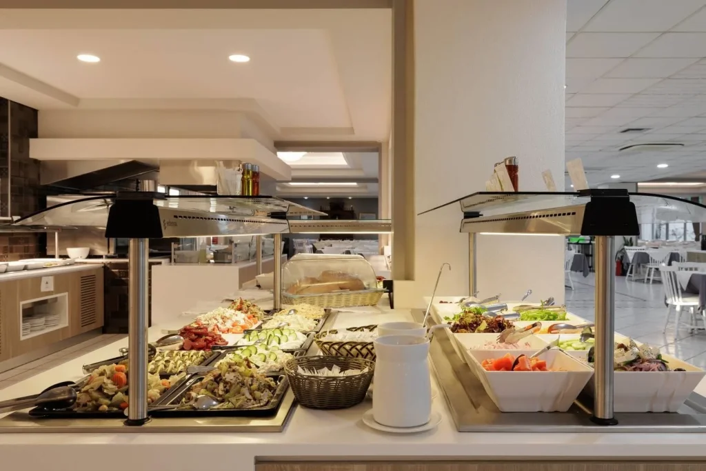 Hotel ofer? un pachet all inclusive generos, care include trei mese principale pe zi servite la bufet: micul dejun între orele 7:30 – 10:30, prânzul între 13:00 – 14:30 ?i cina între 18:15 – 21:30. Pe parcursul zilei, oaspe?ii beneficiaz? de gust?ri care includ înghe?at? ?i deserturi. Un avantaj deosebit al acestui hotel fa?? de multe alte unit??i din Grecia este c? pachetul all inclusive cuprinde consum nelimitat de b?uturi alcoolice ?i nealcoolice, atât locale cât ?i interna?ionale, ceea ce reprezint? un plus real de valoare pentru vacan?a dvs. în Corfu.