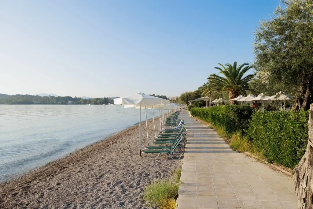 Hotel este situat direct lâng? plaj?, în sta?iunea Dassia, una dintre cele mai apreciate destina?ii de pe Coasta de Est a Corfu-ului. Plaja cu pietri? ?i intrare treptat? în mare se afl? la câ?iva pa?i de hotel, oferind confort ?i siguran?? în special pentru familiile cu copii mici. Centrul sta?iunii se g?se?te la doar 400 de metri distan??, iar op?iunile de cump?r?turi sunt accesibile la 200 de metri. Aeroportul Interna?ional Corfu (Kerkyra) se afl? la 14 km, astfel c? transferul de la aeroport este rapid ?i f?r? b?t?i de cap. Promenada de-a lungul plajei v? invit? la plimb?ri de sear?, iar apropierea de centru înseamn? c? restaurantele, tavernele ?i magazinele locale sunt mereu la îndemân?.