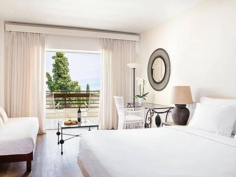 Camera Dubla Superioara cu Vedere la Mare (DRSVS) - identica ca dotari cu camera dubla superioara, insa beneficiaza de o vedere directa spre mare, transformand fiecare dimineata intr-un moment de neuitat in vacanta ta din Corfu.