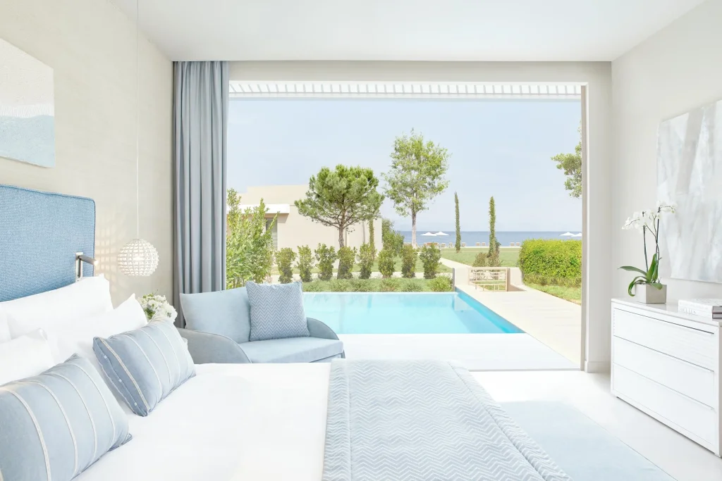 Plaja de nisip privată, cu o lungime de 600 m. Șezlonguri gratuite, umbrele și prosoape de plajă. Este posibil să comandați alimente și băuturi la șezlong (gratuit). Serviciul Babewatch este disponibil - babysitting pe plajă (30 de minute gratuite, copii peste 4 ani). Zonă de plajă exclusivă pentru colecția Ikos Deluxe. Zonă numai pentru adulți.