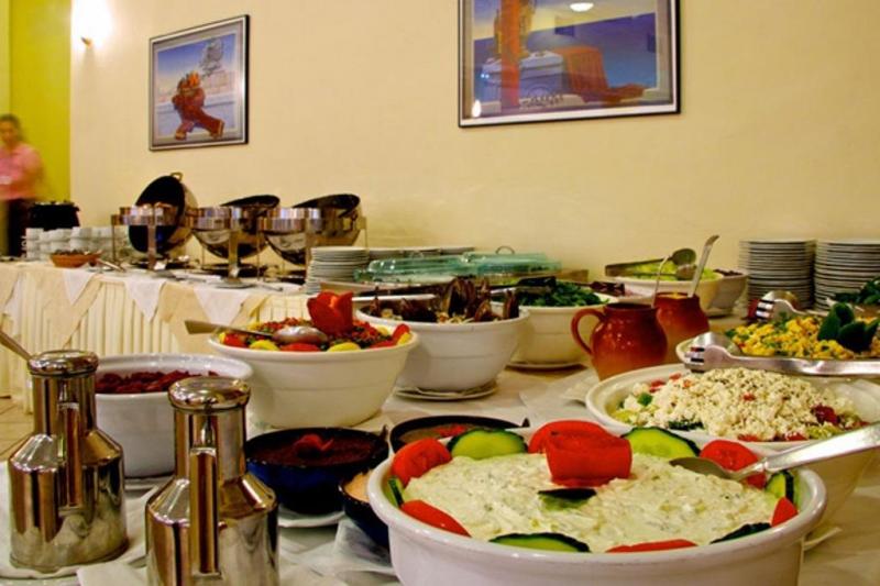 Restaurantul tip bufet servește preparate culinare din bucătăria grecească și internațională. Barul de la piscină oferă băuturi răcoritoare, cocktailuri și gustări.