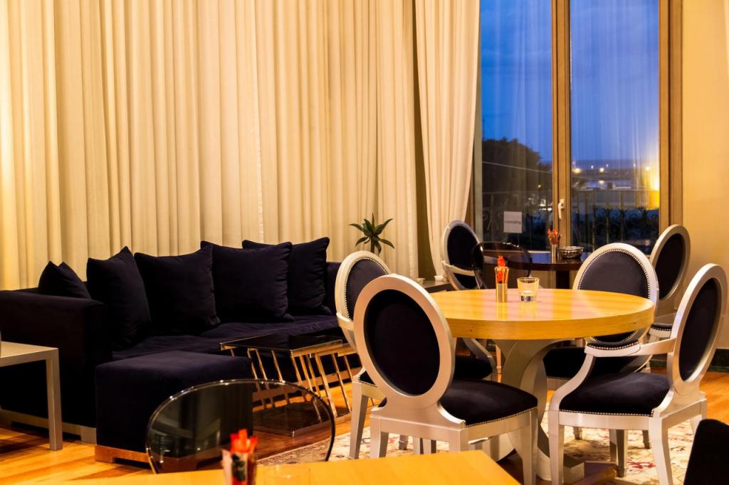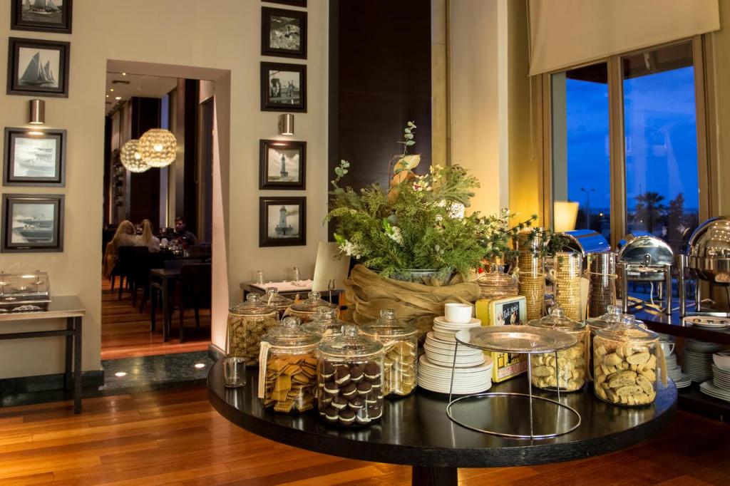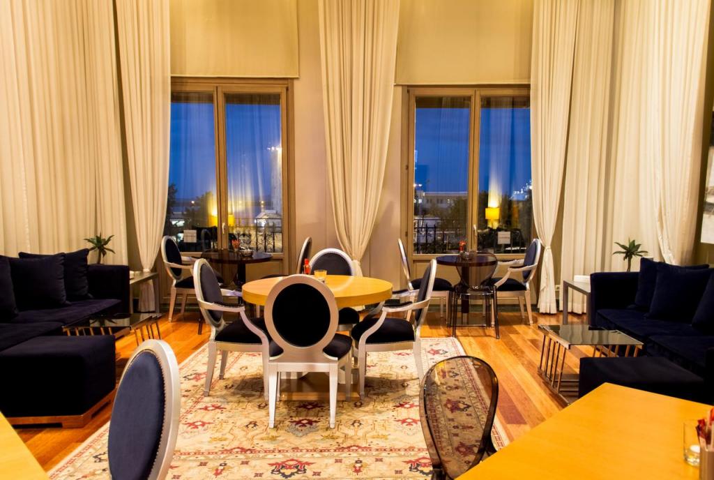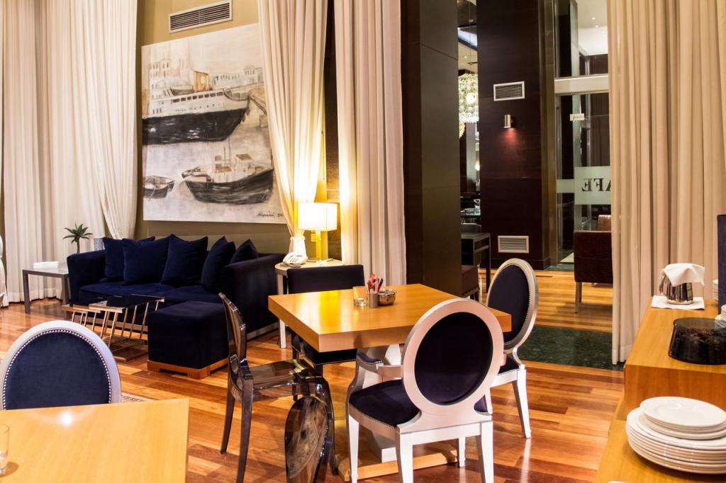 Plaza Café este o cafenea informală deschisă pe toată durata zilei potrivită pentru orice scop și este ideală pentru a vă bucura de micul dejun, de prânz, de cină sau doar pentru o ceașcă de cafea în timp ce admirați priveliștea portului vechi. Lounge-ul Living Room este zona de relaxare ideală situată între cele două atriumuri ale hotelului, oferind un colț TV și o bibliotecă. Barul-restaurant The Megaron 5th se află la ultimul etaj, oferind cea mai impresionantă vedere la vechiul port venețian și la Marea Egee. Acesta combină o locație excelentă, muzica lounge și bucătăria cretană contemporană cu mâncăruri atent selectate pregătite de maestrul-bucătar artizan al hotelului. The Megaron 5th este deschis numai în sezonul estival.