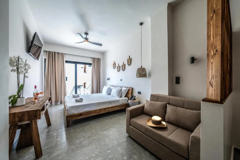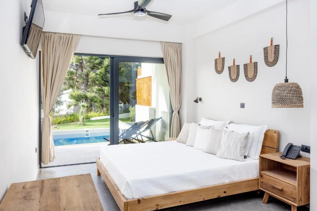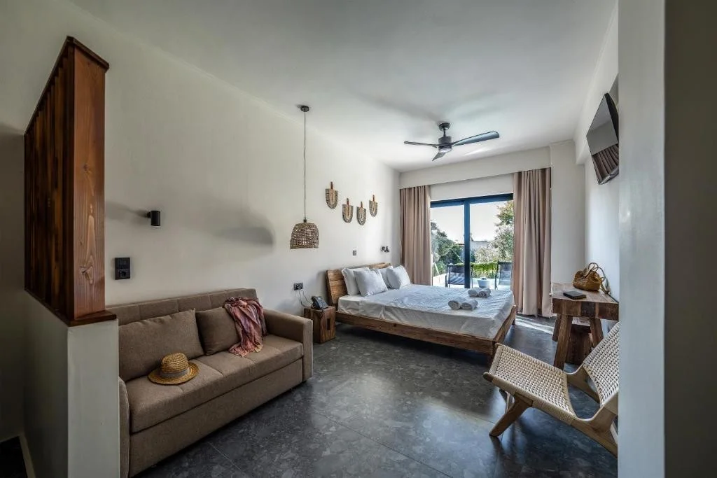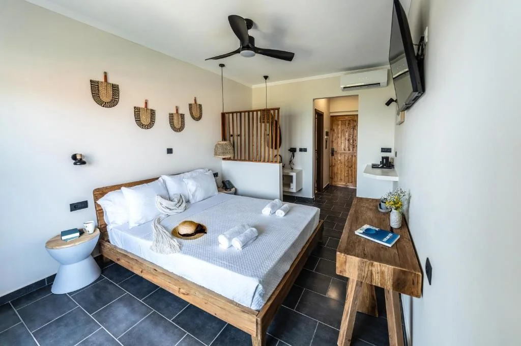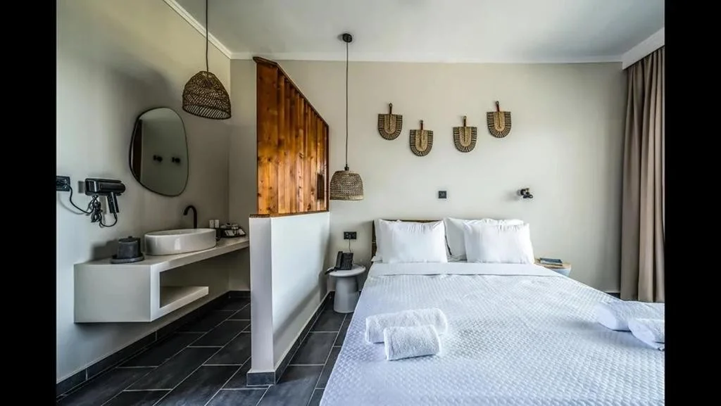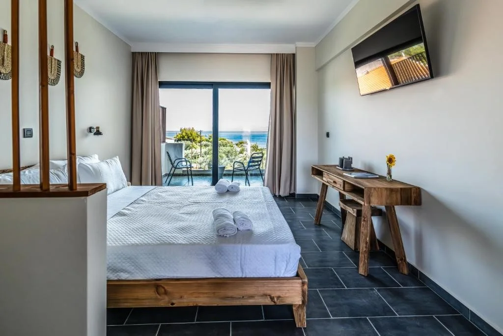 Camera Dubla cu Vedere Laterala la Mare - beneficiaza de aceleasi dotari ca si camera standard, cu avantajul unei perspective catre Marea Egee, perfecta pentru cei care doresc sa se trezeasca cu un strop de albastru in fiecare dimineata.
