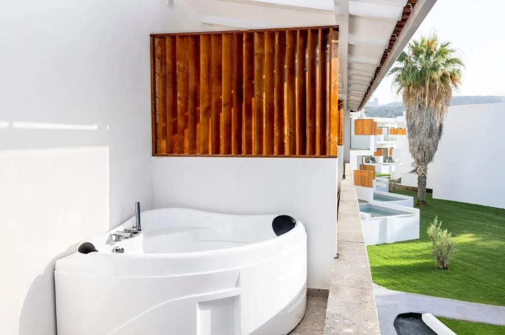 Camera Dubla cu Piscina Privata - varianta cea mai exclusivista a sejurului la Elion Resort & SPA, aceasta camera este mai spatioasa, dispune de o terasa generoasa cu piscina privata si vedere la gradina, oferind intimitate si confort la cel mai inalt nivel pentru cuplurile care cauta o evadare romantica.
