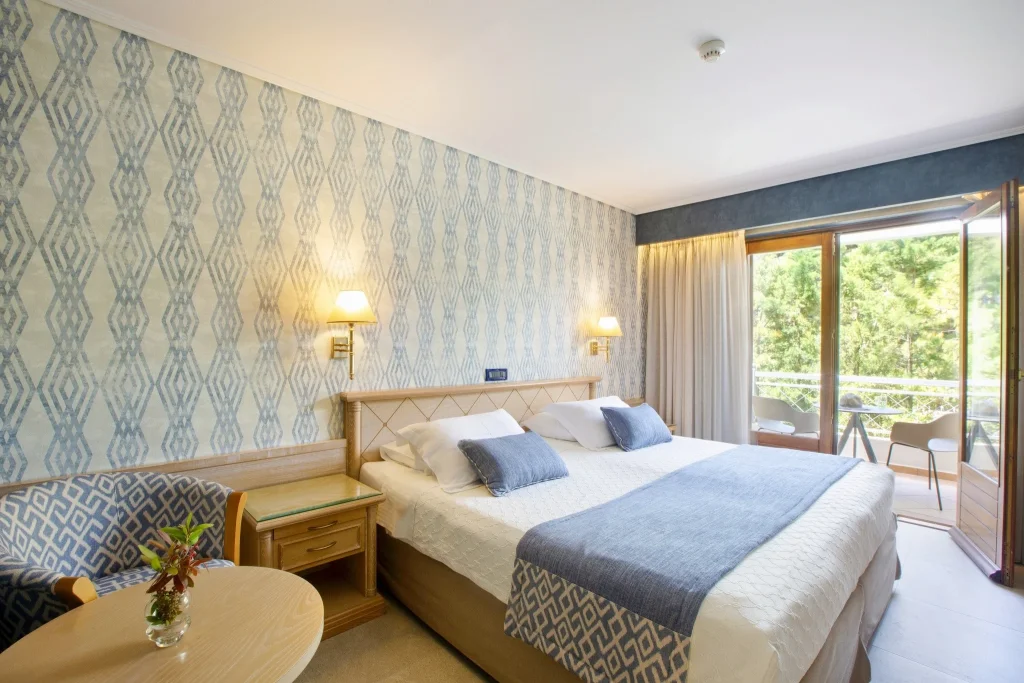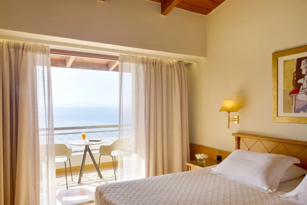 Camera Dubl? Deluxe cu vedere la gr?din? sau mare — mai spa?ioas? fa?? de variantele standard, cu un design contemporan ?i rafinat. Camerele cu vedere la mare ofer? priveli?ti memorabile asupra Golfului Evia, ad?ugând un plus de romantism sejurului. Dot?rile sunt identice cu celelalte tipuri de camere, asigurând acela?i nivel ridicat de confort.