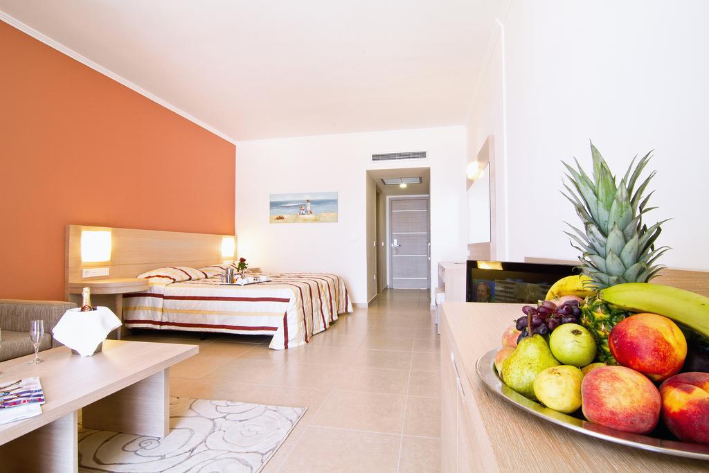--paturi twin, sofa, baie dotata cu cada cu jacuzzi ,produse cosmetice si uscator de par, TV led satelit, mini frigider ( minibar contra cost), aer conditionat gratuit, seif gratuit, telefon, facilitati pentrru ceai/cafea, wi-fi gratuit, prosoape de plaja ( depozit 10 eur/buc), veranda cu vedere la mare si la piscina proprie si sezlonguri gratuite la piscina proprie