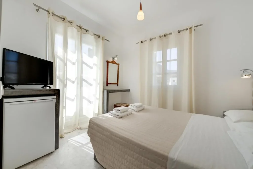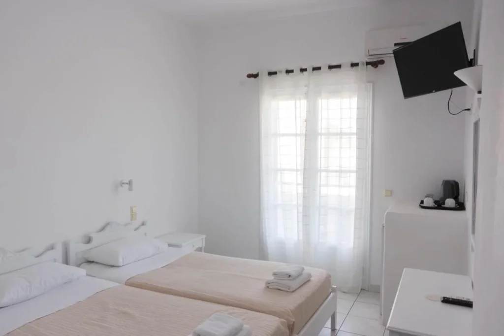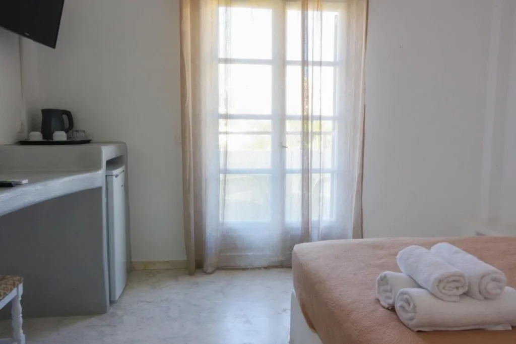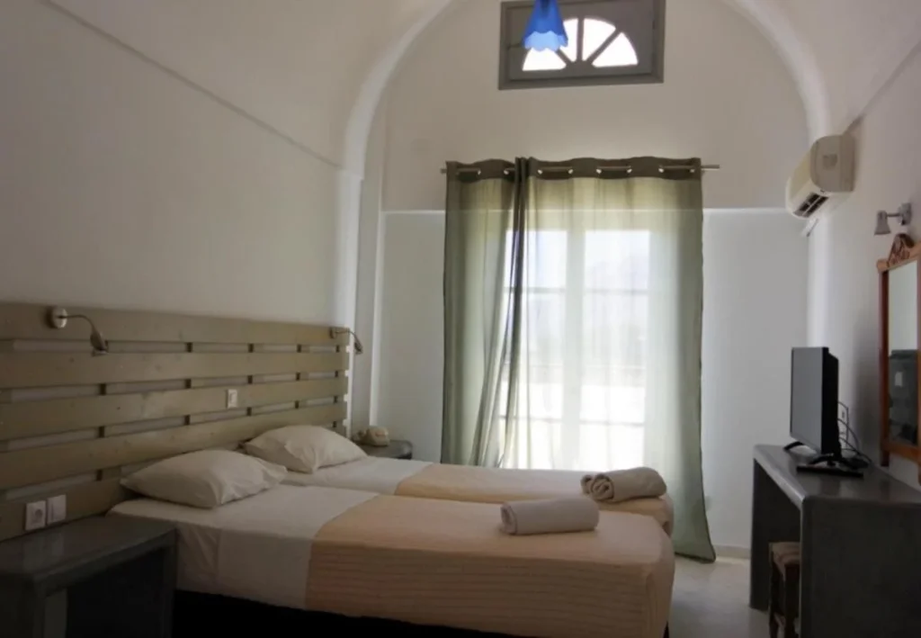 Camera Dubl? cu vedere la gr?din? – Conceput? pentru 2 persoane, aceast? camer? ofer? un spa?iu confortabil decorat în stil mediteranean, cu balcon sau teras? cu vedere spre gr?dina hotelului ?i spre peisajul cu biserici alb-albastre. Dot?rile includ aer condi?ionat (gratuit), televizor prin satelit, telefon, seif (gratuit), minifrigider (gratuit), fierb?tor electric, usc?tor de p?r, baie privat? cu toalet? ?i conexiune Wi-Fi gratuit?.
