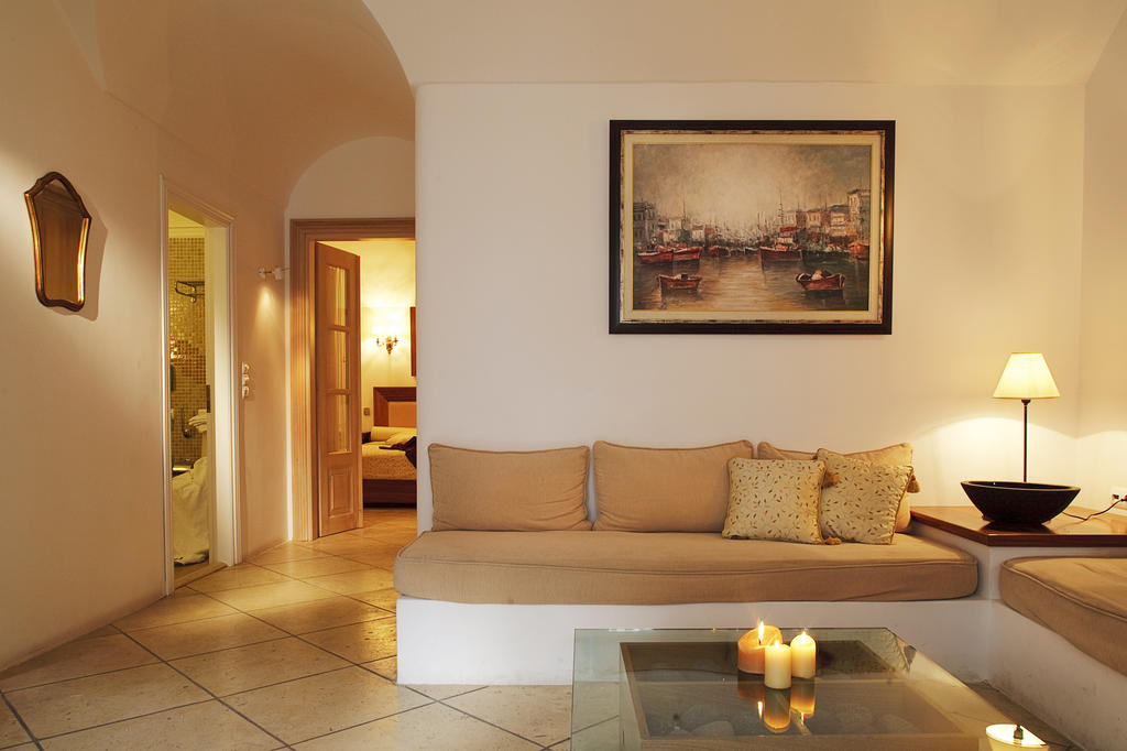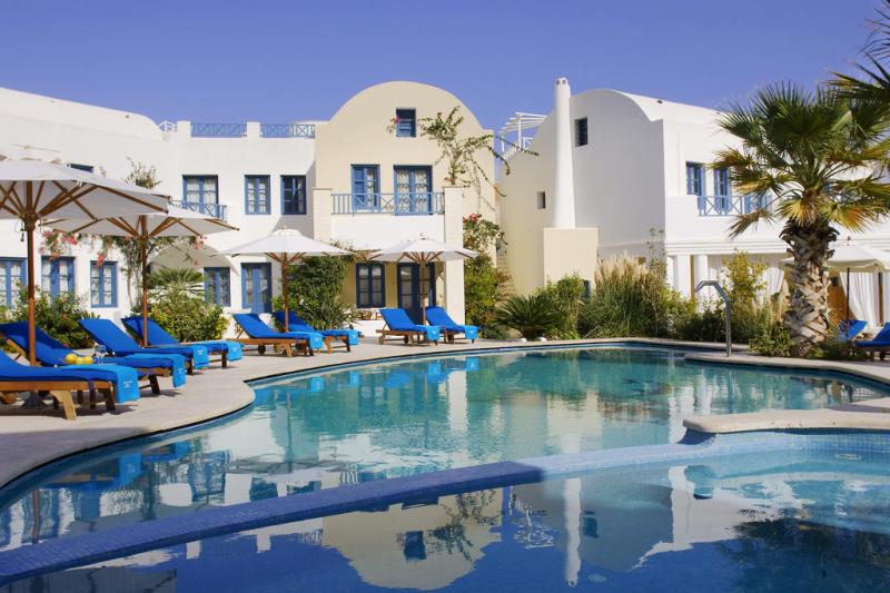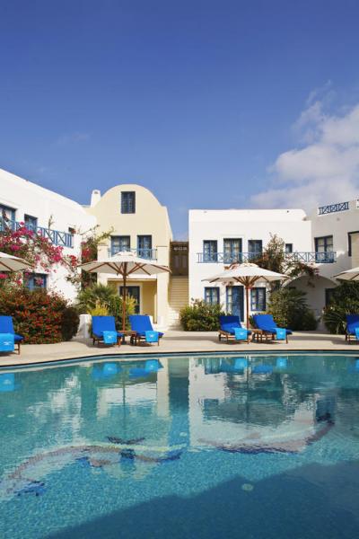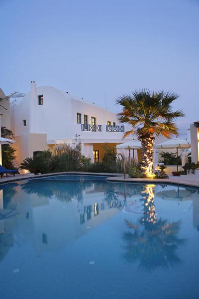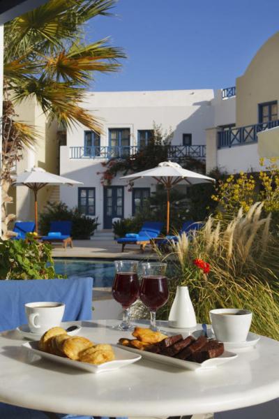 Hotelul este situat in imediata apropiere a supermarketului, restaurantelor si ATM – 10 m, statie de autobuz – 30 m, Aeroportul International – 4 km, portul Athinios – 12 km, capitala Fira – 8 km.