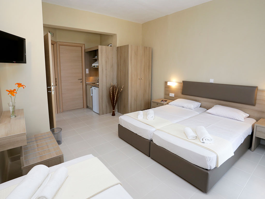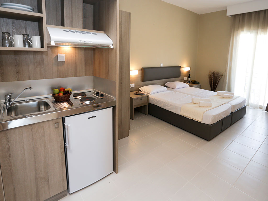 Apartamente confortabile, la o mica distanta fata de mare. Camere confortabile cu chicineta, stil modern, acces la internet. In apropierea hotelului veti gasi magazine, taverne grecesti, cafenele si baruri.