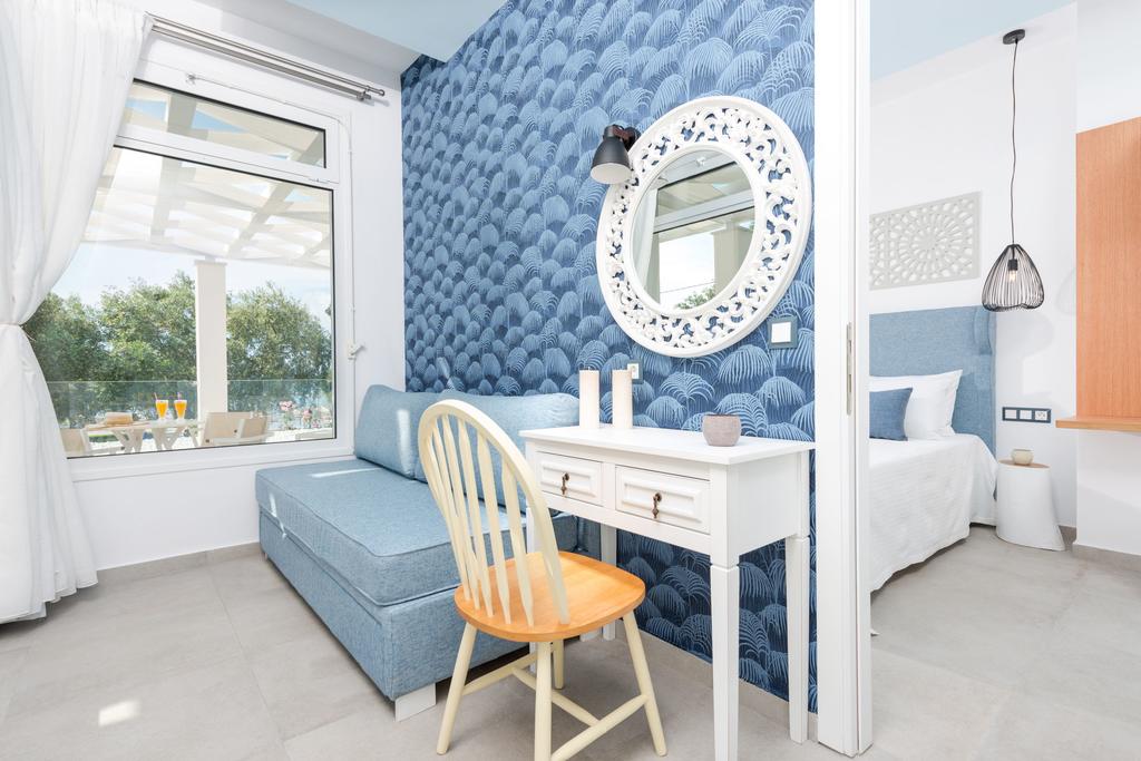 Camerele sunt luminoase și aerisite, iar fiecare are un balcon sau terasă cu vedere la împrejurimile luxuriante, la piscină sau la Marea Ionică. Fiecare cameră este dotată cu aer condiționat, frigider și televizor. Sunt disponibile și camere de familie.
