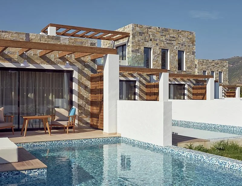 Camera Dublu cu Piscin? Privat? – Emblema hotelului, aceast? camer? exclusivist? vine completat? cu propria piscin? privat? pe teras?, transformând sejurul într-o experien?? cu adev?rat special?. Camera este dotat? cu aer condi?ionat, televizor cu canale prin satelit, minibar (contra cost), seif, ceainic, telefon ?i usc?tor de p?r. Baia privat? include du? ?i toalet?, iar terasa spa?ioas? cu piscina privat? devine spa?iul ideal pentru momente de relaxare total? în intimitate deplin?.