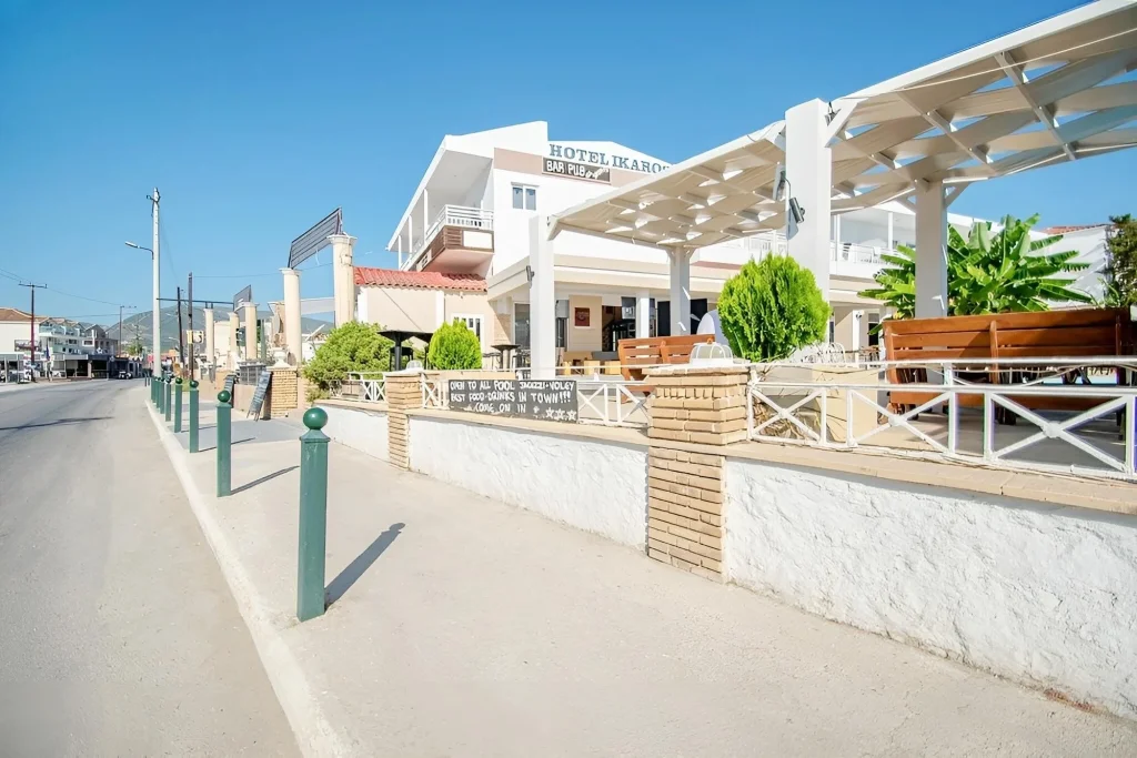 Hotelul Ikaros este situat la 4 km de aeroportul internațional Zakynthos și la 7 km de orașul și portul Zakynthos. Satul Argassi, cu plaja sa de nisip, se găsește la 10 km. ÃŽn apropiere există o parcare publică gratuită.