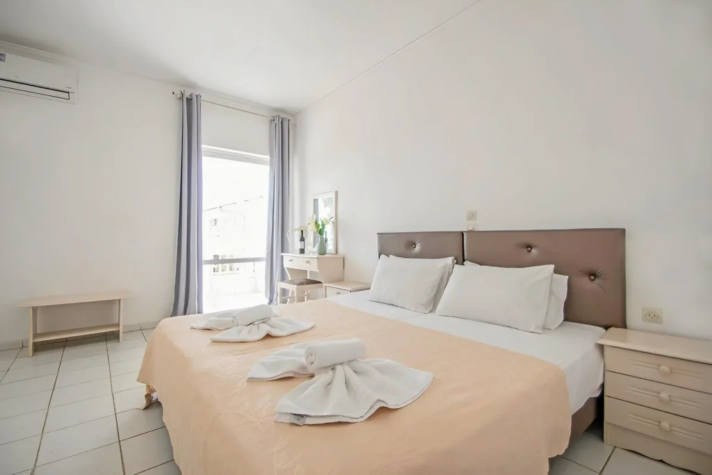 Dotate cu pardoseală cu gresie, camerele de la Ikaros sunt decorate simplu și oferă vedere la piscină sau la munte. Fiecare unitate de cazare are baie privată cu duș.