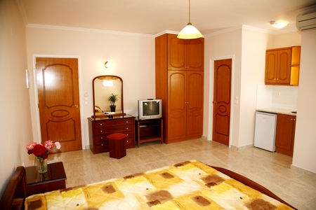 Toate camerele sunt foarte ingrijite si sunt dotate cu TV, aer conditionat, frigider, seif (contra cost), baie cu dus, uscator de par, balcon cu vedere la gradini sau la piscina. Camerele au chicineta utilata (aragaz electric cu doua plite, ceainic electric, vesela). Camerele family au dormitor cu pat dublu si living cu doua paturi de o persoana.