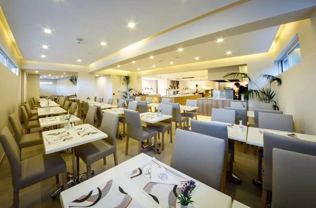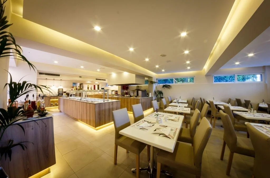 Hotelul ofer? mai multe formule de mas? adaptate preferin?elor fiec?rui turist. Micul dejun bufet se serve?te între orele 8:00 ?i 10:00. În formula demipensiune, cina tip bufet este disponibil? între 19:00 ?i 21:00. Formula all-inclusive include micul dejun (8:00–10:00), prânzul (12:30–14:30) ?i cina (19:00–21:00) sub form? de bufet, la care se adaug? b?uturi non-alcoolice ?i alcoolice în intervalul 11:00–23:00, la ore ?i locuri stabilite de hotel. Toate mesele se servesc în restaurantul Estia al hotelului vecin Planos.