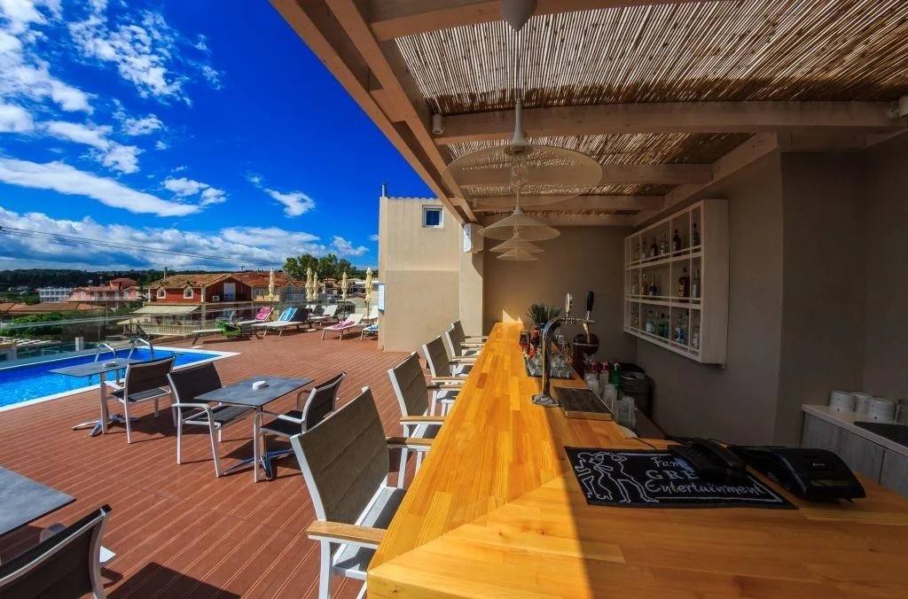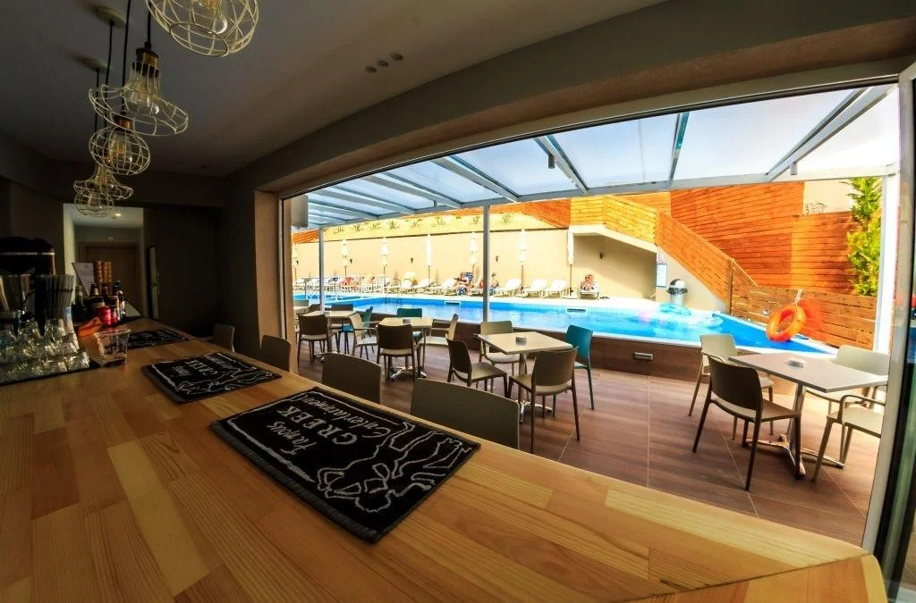 Hotelul pune la dispozi?ia oaspe?ilor un hol de intrare spa?ios, recep?ie cu program permanent ?i 2 lifturi pentru accesul facil la toate etajele. Wi-Fi-ul gratuit este disponibil atât în camere, cât ?i în holul de intrare. Proprietatea dispune de 2 piscine: una la nivelul solului ?i una spectaculoas? pe acoperis, înso?it? de o teras? de plaj? ?i un bar cu panoram? frumoas? asupra împrejurimilor. Un bazin dedicat copiilor completeaz? oferta acvatic?. ?ezlongurile ?i umbrelele de la piscine sunt incluse gratuit, iar prosoapele sunt disponibile contra unui depozit rambursabil de 5 EUR (schimbul cost? 1 EUR). Restaurantul ?i barul hotelului completeaz? oferta de servicii intern?. De men?ionat c? mesele în regim de demipensiune ?i all-inclusive se servesc în restaurantul Estia al hotelului vecin Planos, cu orar bine structurat pentru fiecare mas? a zilei. Pe plaj?, ?ezlongurile ?i umbrelele sunt disponibile contra cost.