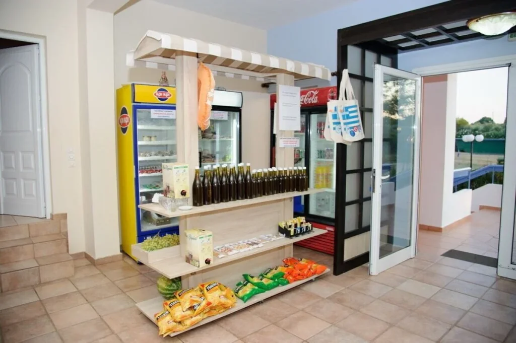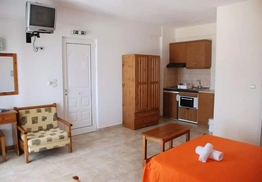 Hotelul Aithrio este organizat in trei cladiri distincte, cu un total de 20 de camere, inconjurate de verdeata abundenta. La dispozitia oaspetilor se afla un hol cu receptie si un lounge cu televizor, spatii propice relaxarii si socializarii. Un element cu adevarat special al hotelului este taverna traditionala asezata pe stanca, cu vedere directa la mare, unde poti savura micul dejun, pranzul si cina intr-un cadru de vis. Un mini market la fata locului asigura accesul facil la produse de baza fara a fi nevoie sa parasesti incinta hotelului. WiFi-ul gratuit este disponibil in camere, iar chicineta din fiecare unitate de cazare confera o independenta apreciata in special de familiile cu copii.