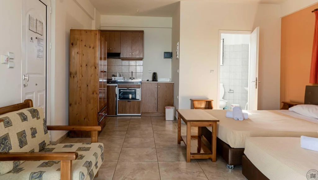 Camera Cvadrupla - cea mai incapatoare optiune de cazare la Hotelul Aithrio, dispusa cu un al patrulea pat fix si o suprafata superioara. Pastreaza dotarile complete ale celorlalte tipuri de camere si poate gazdui familii cu doi copii sau grupuri de patru persoane. Chicineta functionala permite prepararea meselor acasa, o facilitate apreciata mai ales de familii.
