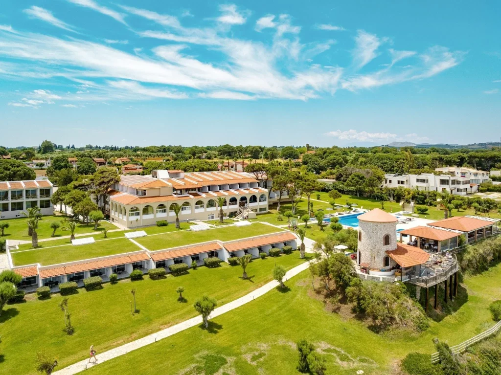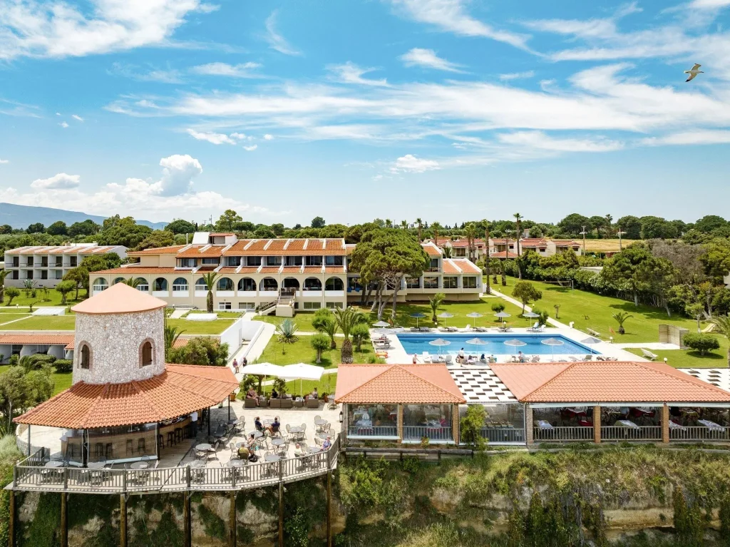 Hotelul se afla pozitionat la aproximativ 15 metri deasupra nivelului marii, oferind o priveliste frumoasa asupra Golfului Patras. Plaja proprie cu nisip si pietricele se afla direct sub hotel, accesibila pe scari sau pe o poteca in panta usoara, la doar cateva minute de mers pe jos. Orasul Kato Achaia, cu magazine si posibilitati de divertisment, se gaseste la aproximativ 4 km distanta, iar aeroportul Araxos este la circa 15 km. Municipiul Patras, cel mai mare oras din Peloponez, se afla la 27 km, in timp ce Atena este la 250 km. Pentru cei interesati de turism cultural, celebrul sit arheologic Olympia poate fi vizitat de la o distanta de aproximativ 90 km, o excursie de o zi excelenta.