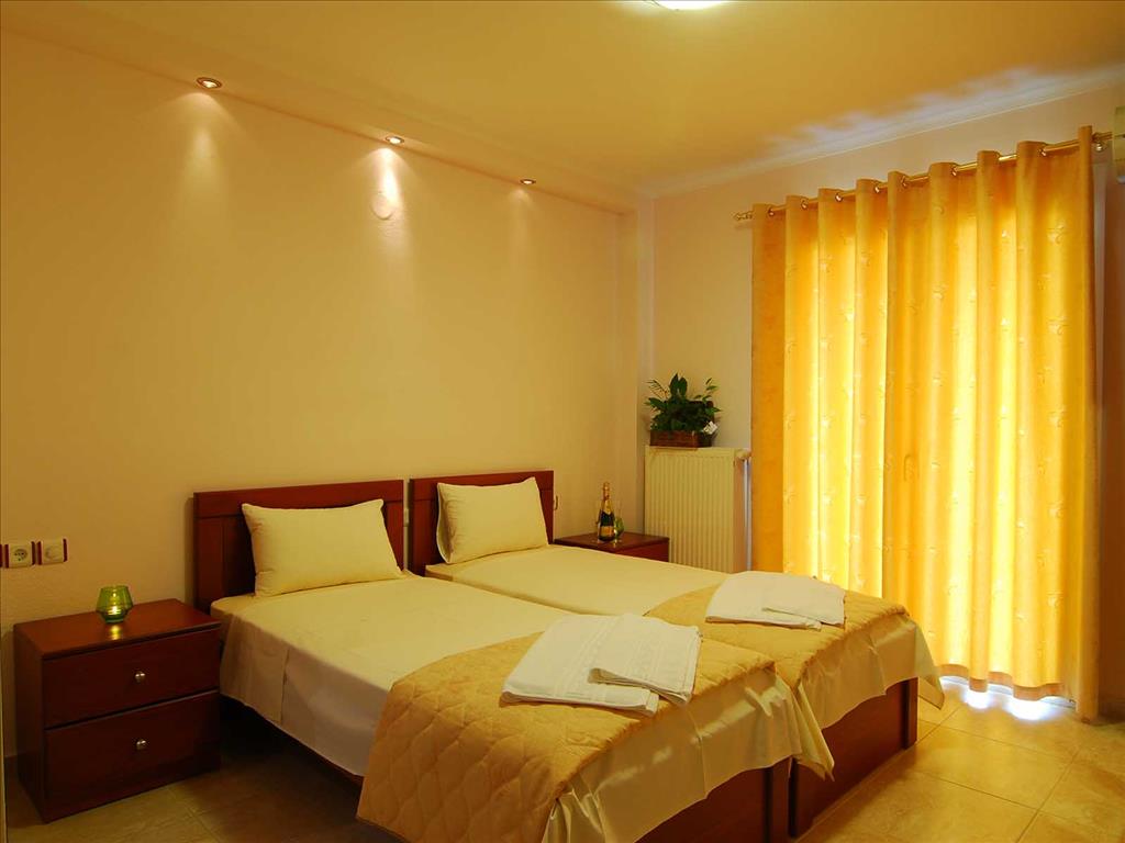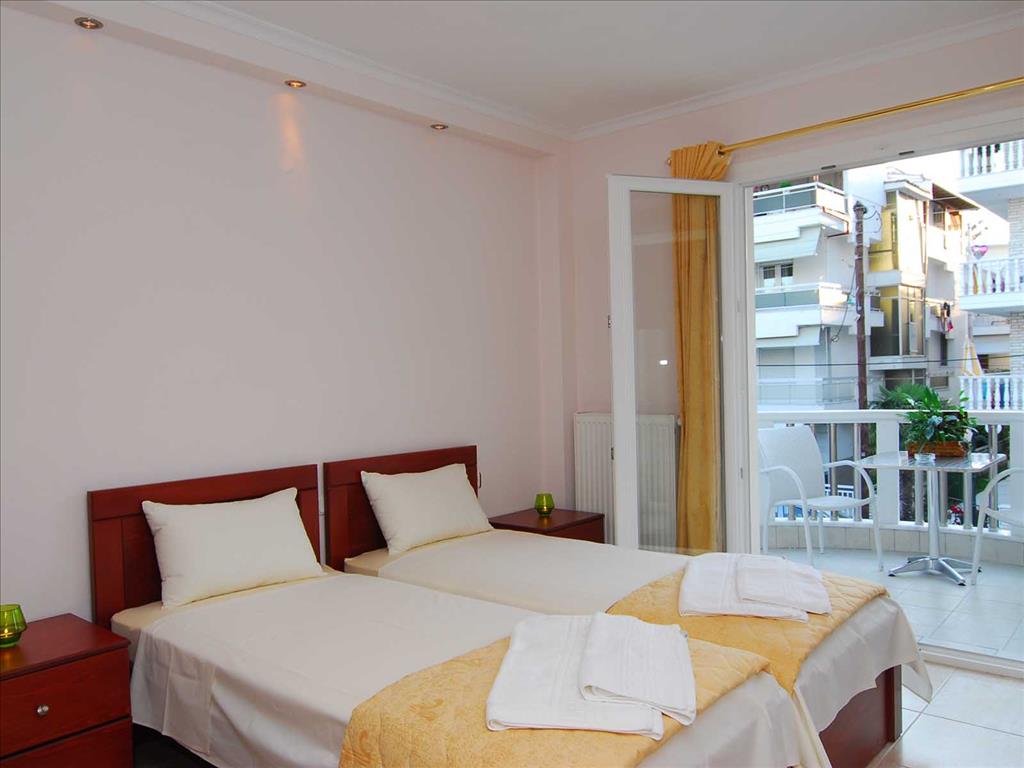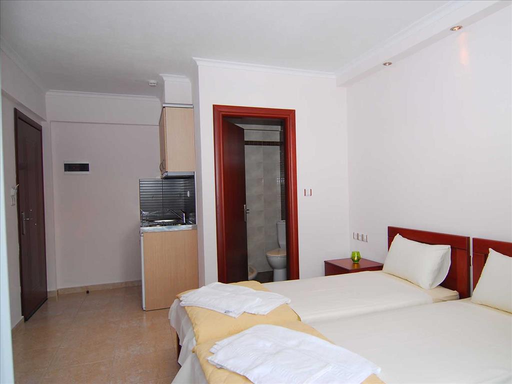- un apartament ( 2 incaperi, baie), dotat cu aer conditionat, TV, frigider, bucatarie utilata, internet Wi-Fi. Balconul, ofera o priveliste minunata spre Marea Egee; este format dintr-o camera de dormit cu pat dublu, salon cu canapea extensibila pentru 2 persoane, bucatarie utilata.