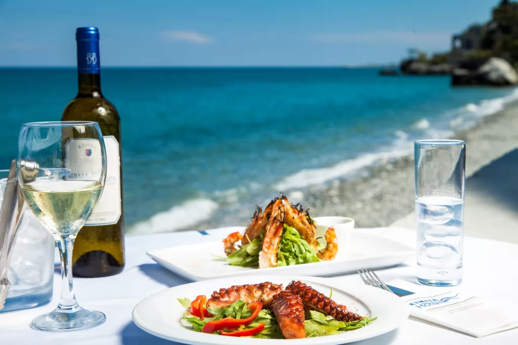 Restaurantul hotelului servește preparate grecești autentice, inclusiv opțiuni pentru vegetarieni. Acesta are ferestre mari cu vedere la mare. Barul de la Hotelul Kymata este deschis pe tot parcursul zilei.