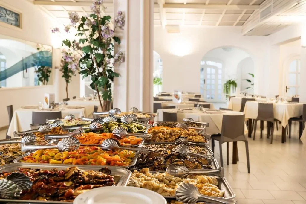 Gastronomia este bine reprezentată prin mai multe opțiuni: un restaurant principal, o tavernă cu specific local și un lobby bar, completate de un bar situat lângă piscină pentru refreshmente răcoritoare pe parcursul zilei. Masa se servește în sistem bufet, indiferent de formula aleasă – mic dejun, demipensiune (mic dejun și cină) sau pensiune completă (mic dejun, prânz și cină).
