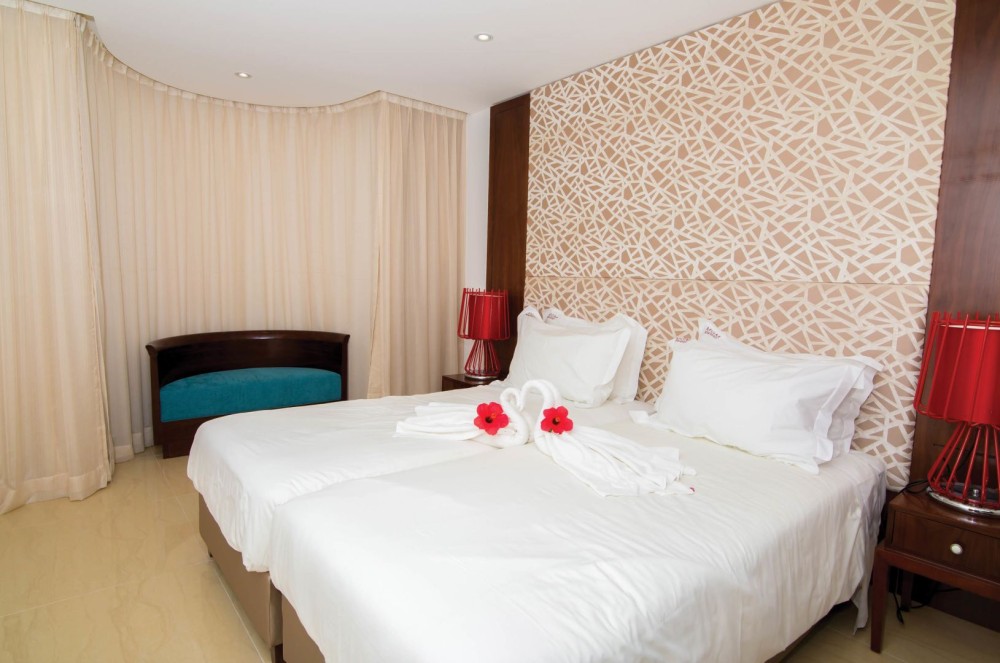 Toate cemerele din hotelul situat chiar în fața plajei sunt dotate cu aer condiționat, living, televizor cu ecran plat, seif și baie privată cu articole de toaletă gratuite și uscător de păr. Toate camerele au, de asemenea, balcon cu vedere la plajă, piscine sau grădini.