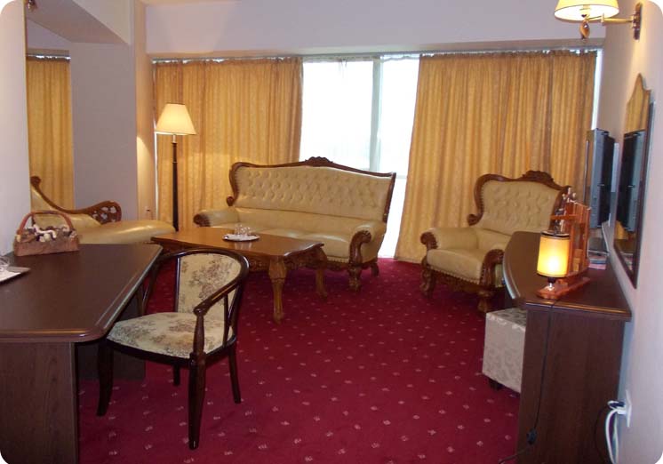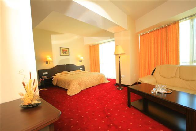 - 4 Junior Suite, Suprafata: 46 mp, Tip pat: 1 pat King Size (200 cm/200 cm), Spatiu de living cu canapea, fotolii si sezlong. Dotari suplimentare: birou, facilitati de pregatire ceai/cafea, Jacuzzi