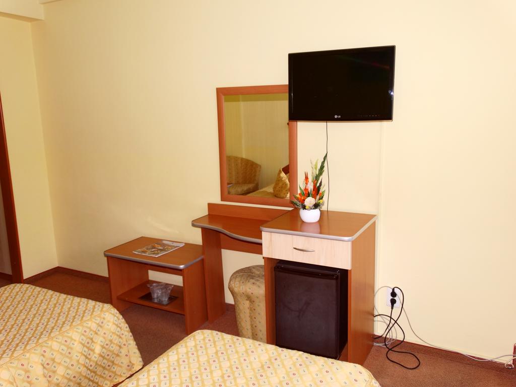 Camerele duble sunt prevazute cu baie proprie cu cada sau dus, cu TV, minibar, frigider, aer conditionat, uscator de par, telefon si balcon, accesul facându-se pe baza de cartela magnetica.