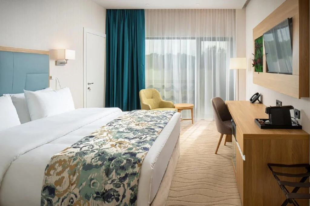 Camera Standard King – pat matrimonial King size, control digital al confortului camerei, Smart TV cu ecran plat, minibar, seif, aer condiționat, baie cu duș, cosmetice de calitate, uscător de păr, aparat de cafea cu capsule, WiFi gratuit, apă plată la sosire, lenjerie de pat și prosoape incluse.