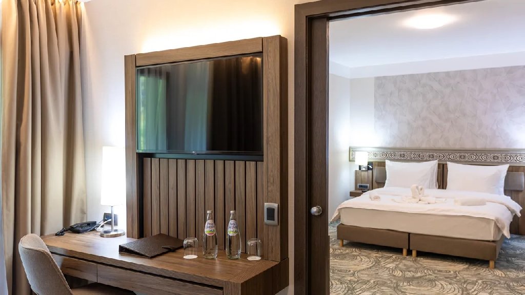 formata dintr-o camera de lux, o baie, living, toate dotate cu facilitati de ultima generatie, mini-bar, linie telefonica direct, uscator de par, fier de calcat si masa de calcat (la cerere), blocare electronica a cardului cu cheie, detector de fum, TV LCD cu ecran plat, suport pentru bagaje, TV prin satelit, baie eleganta cu cabina de dus, dulap, aparat de cafea, scaun tapitat cu cotiere, seif, fotoliu extensibil cu lenjerie de pat.