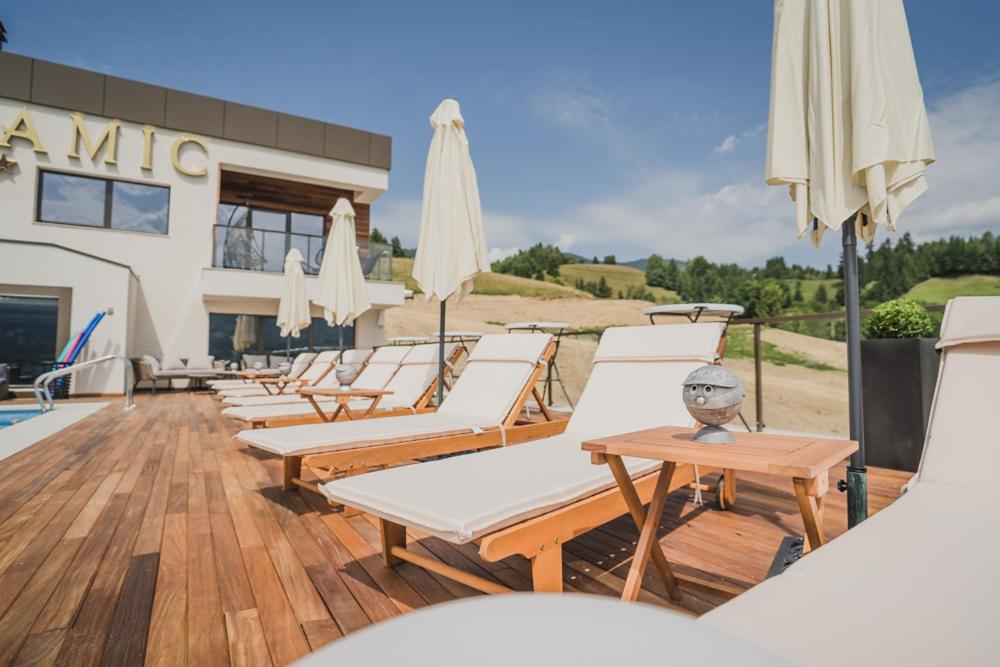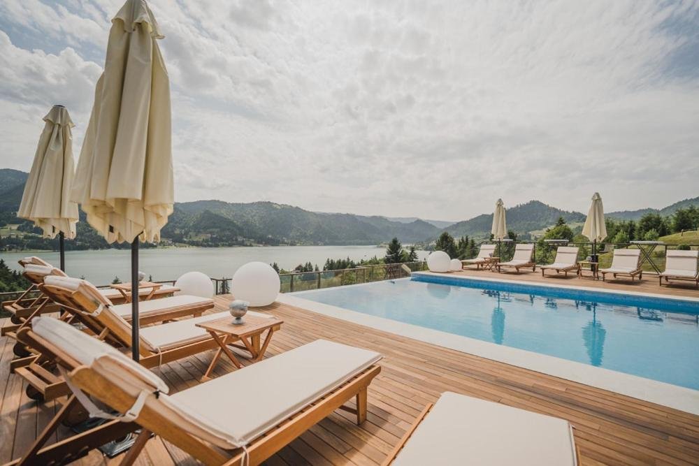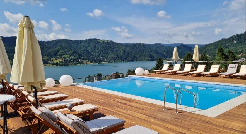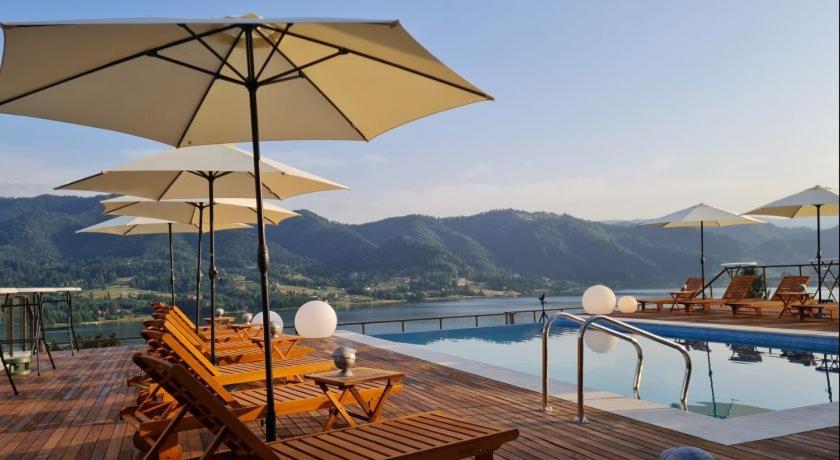 Turistii se pot bucura de piscina pe tot parcursul anului. Pot admira panorama asupra lacului Colibita si a muntilor direct din piscina infinity incalzita, la o temperatura medie de 38 de grade. Este amplasata perfect la etajul superior, conceputa sa fie folosita tot timpul anului pentru un sejur memorabil.